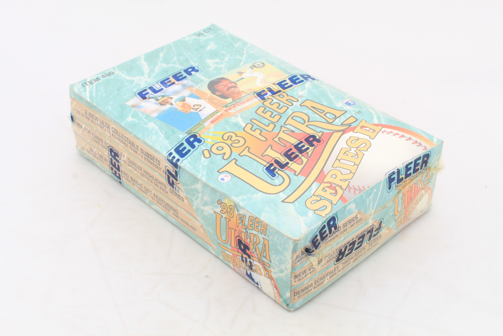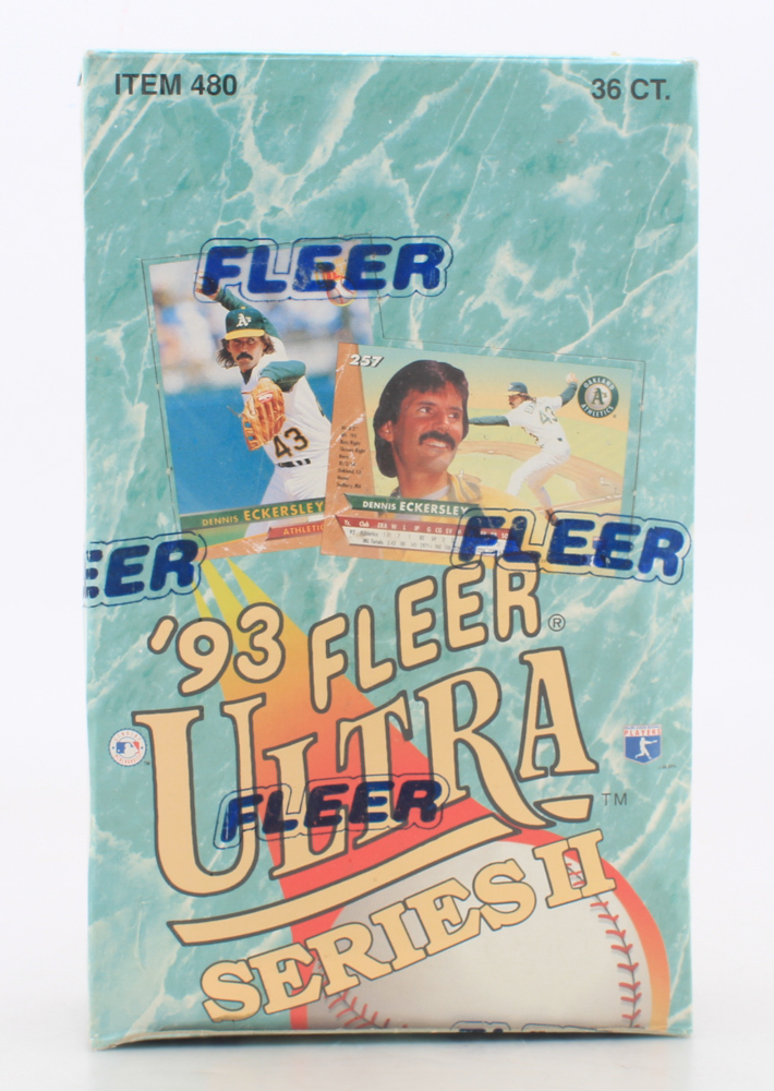 Unopened 1993 Fleer Ultra Series 2 Baseball Box. (36) packs per box. 3 New Ultra Collectable Subsets: 20 Ultra All-Stars, 10 All-Rookie Team, 5 Strikeout Kings!! Look for Dennis Eckersley "Career Highlights" Series!! All New 350 Card Basic Set Featuring: 83 Ultra Rookies, Trades, Other Veterans, 51 Rookies and Marlins!
