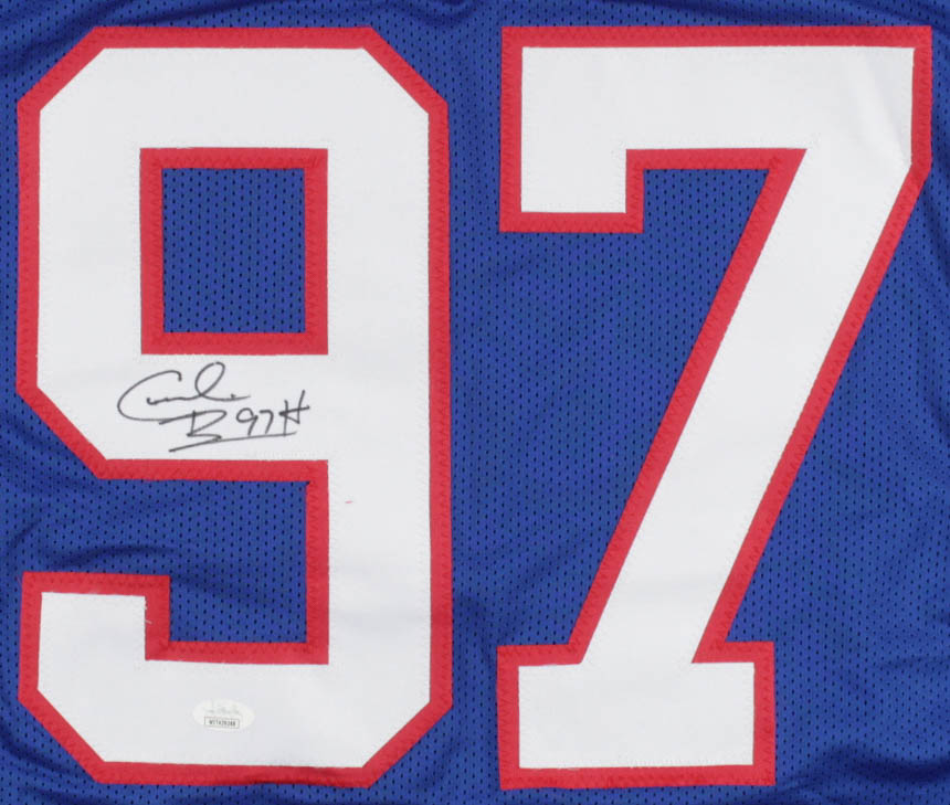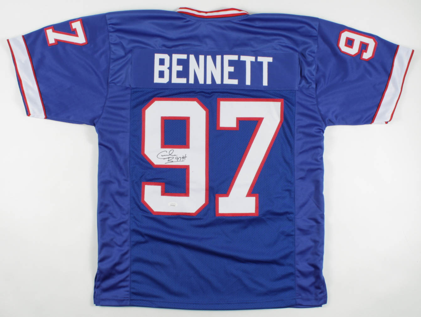 Custom on-field style jersey. Everything is sewn on, size XL. Has been hand-signed by Cornelius Bennett.