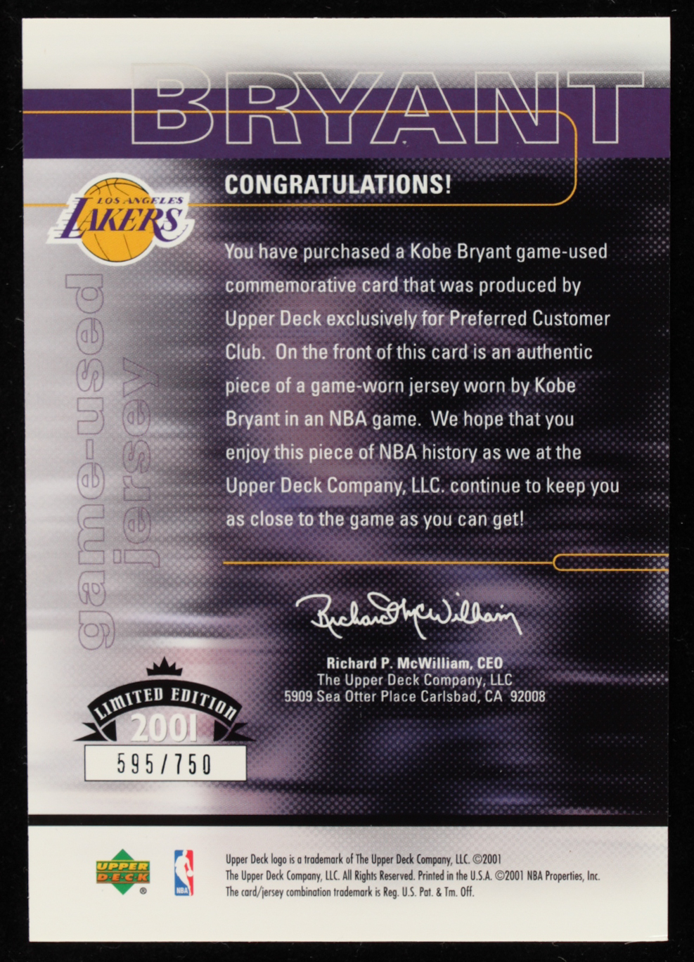 Kobe Bryant 2001 Upper Deck Game-Used Jersey Card