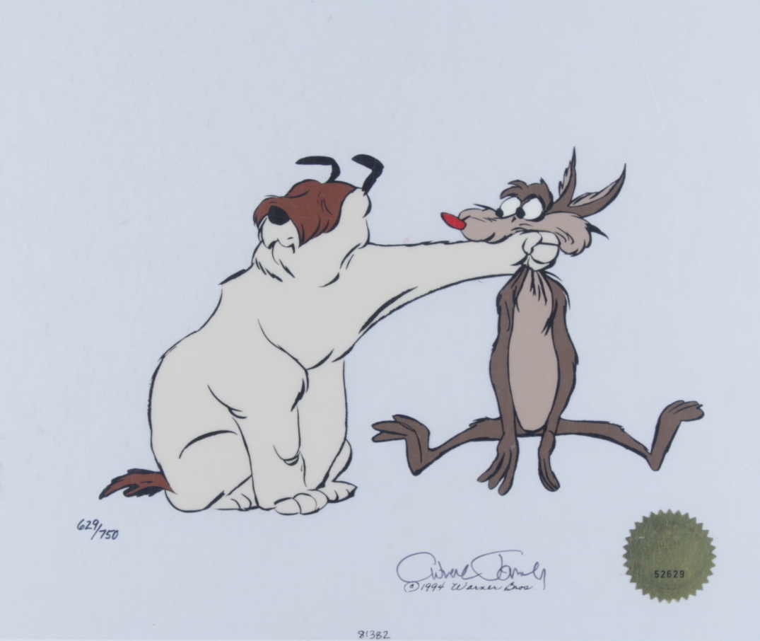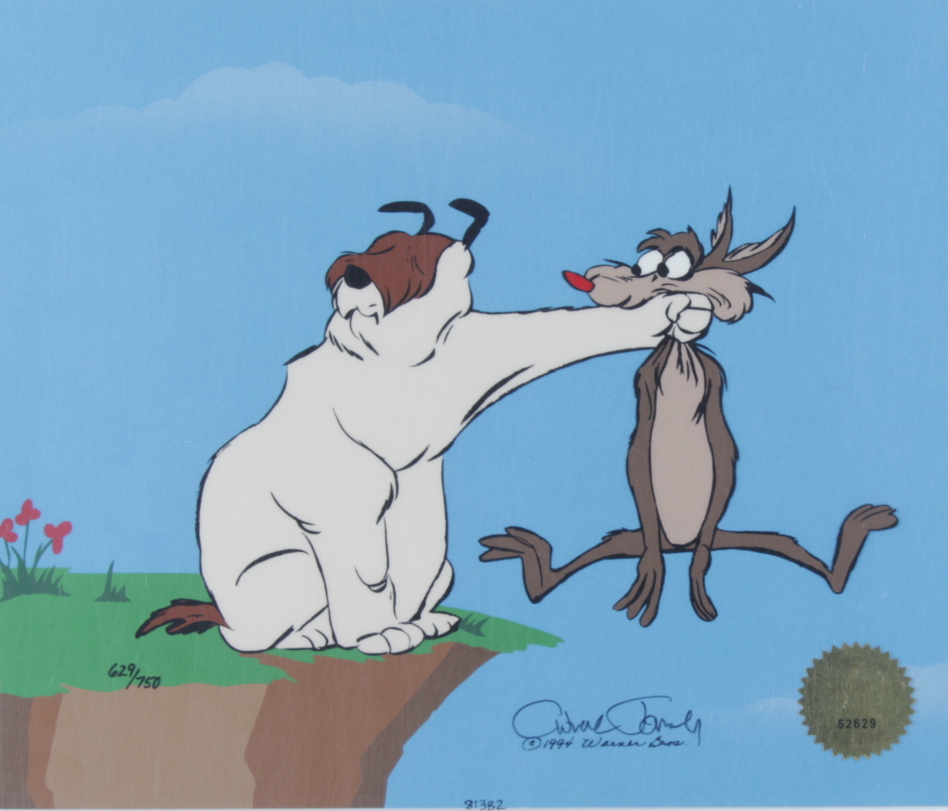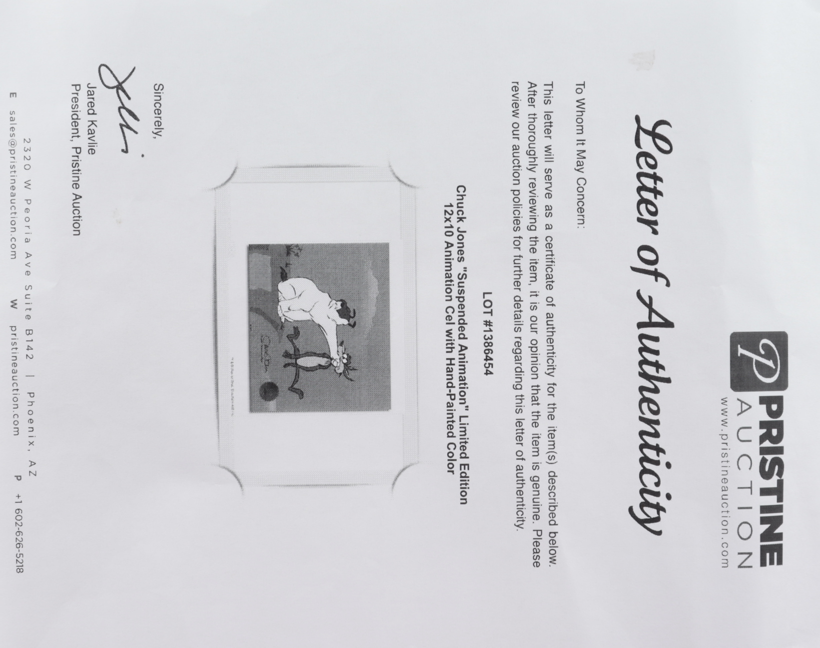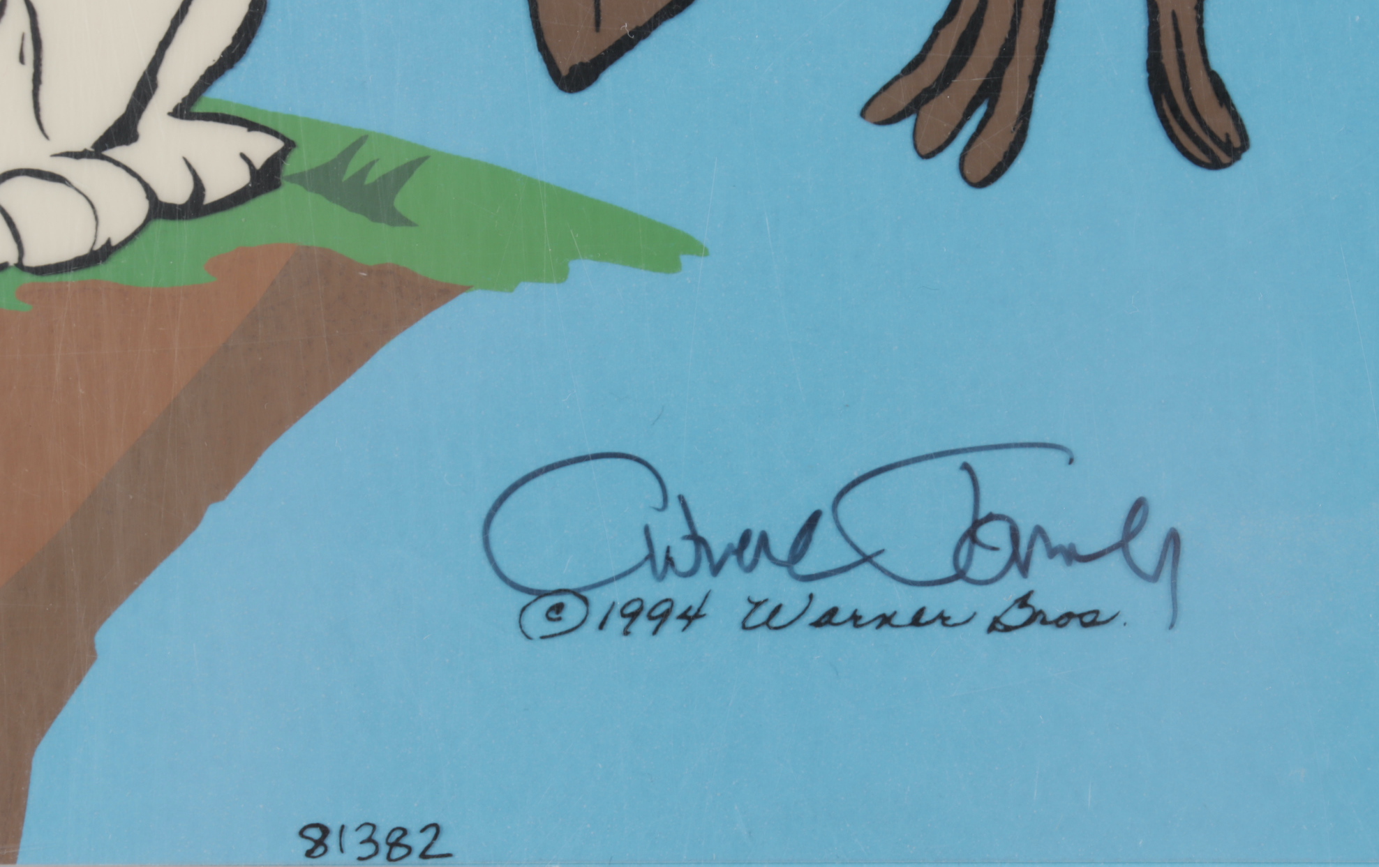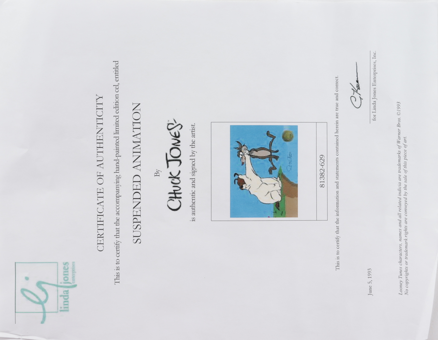 Original animation production cel measures approximately 10" x 12" in size. Painted and hand-signed by Chuck Jones (D. 2002). The cel was used in the production of the Looney Tunes & Merrie Melodies episode “Suspended Animation”. Cel is limited edition and has been hand-numbered #629/750.