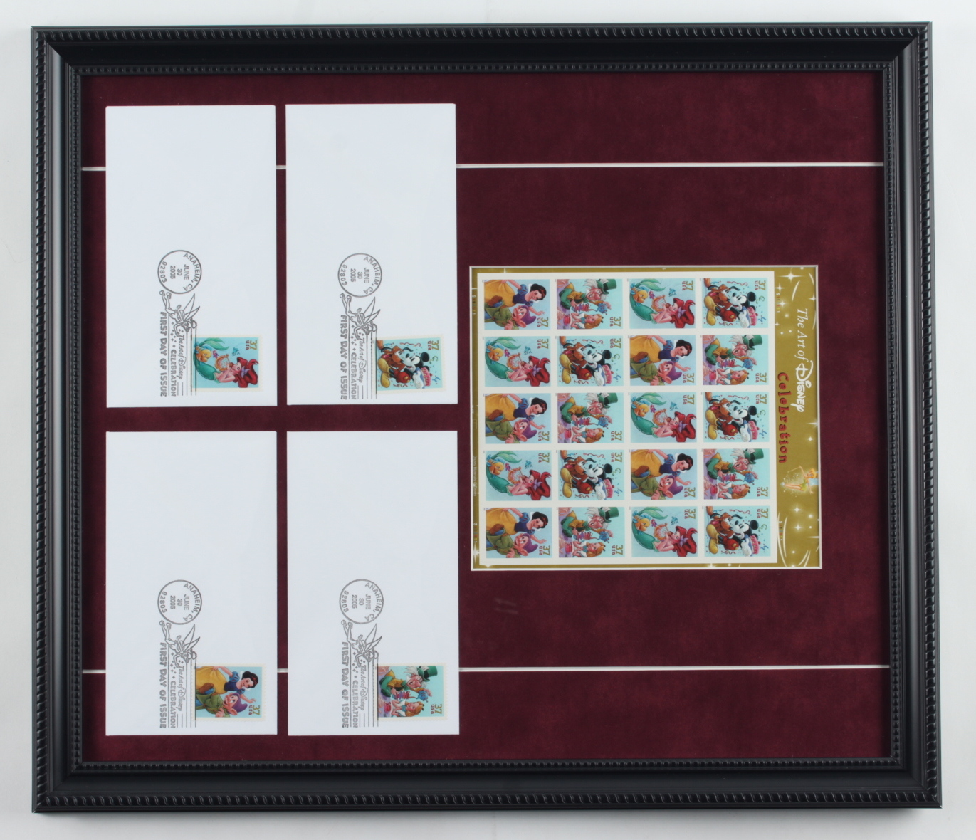 Custom frame measures 17" x 19.5" in size and features (4) Disneyland Envelopes. Display also features a Disneyland uncut stamp sheet.