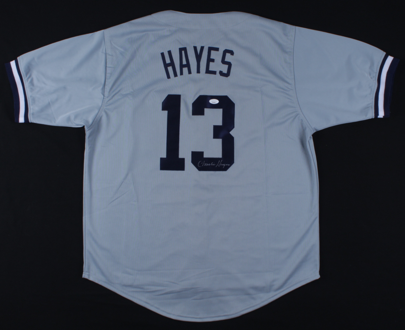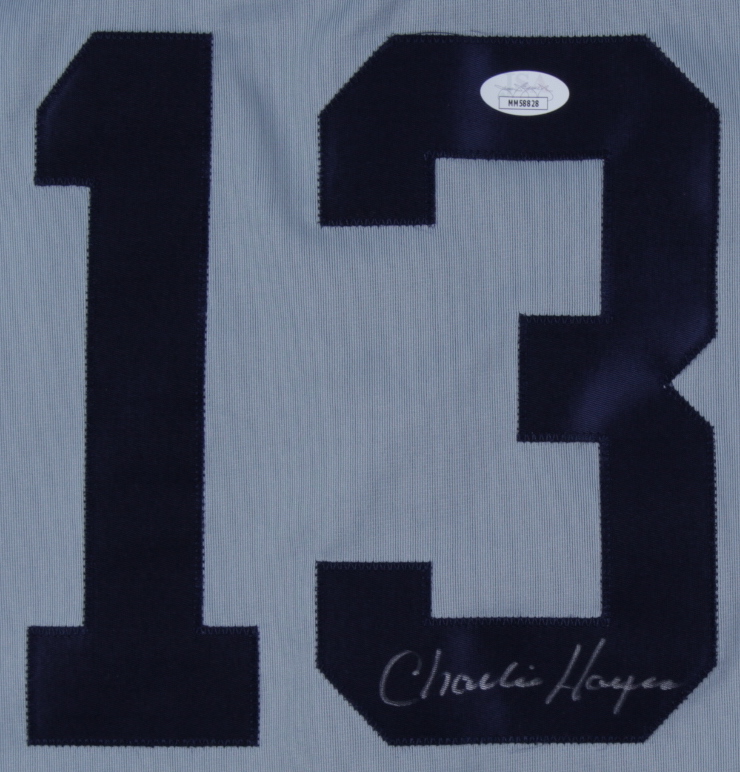 Custom on-field style jersey. Everything is sewn on, size XL. Hand-signed by Charlie Hayes.