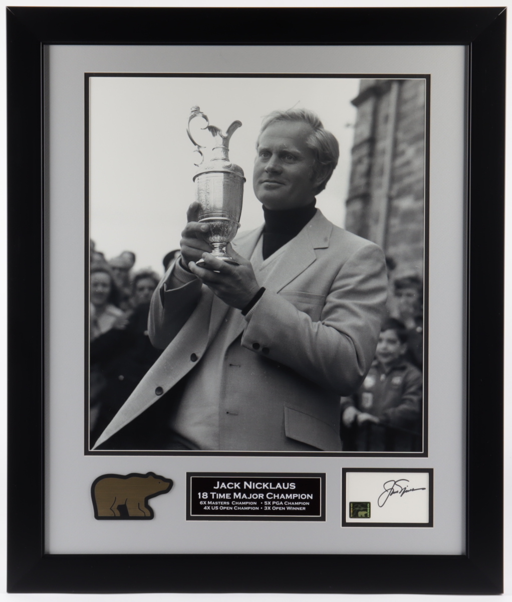 Custom frame measures approximately 23" x 27" in size and features a photo that has been hand-signed by Jack Nicklaus (HOF). Please note, the frame shows signs of handling.