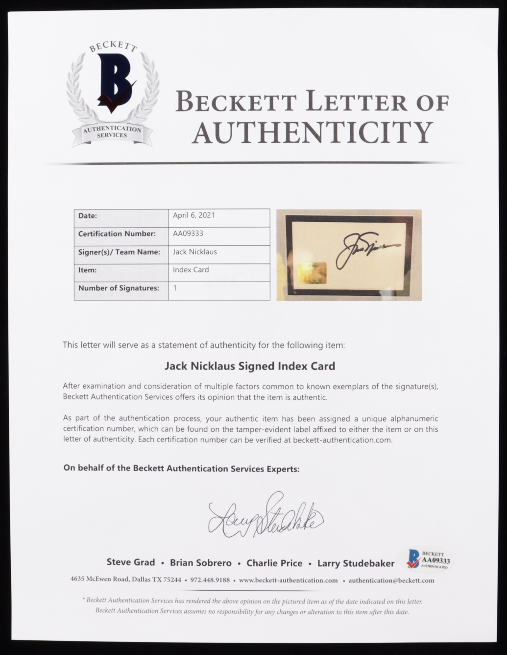 The lot / autograph(s) includes an official Beckett Authentication Services hologram and matching LOA as well as an official Jack Nicklaus hologram for authenticity purposes.