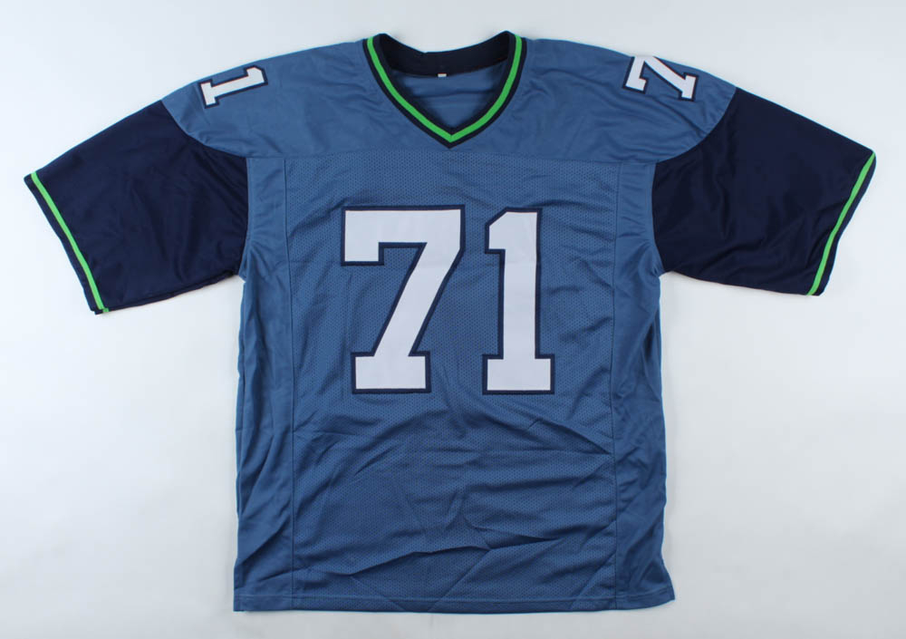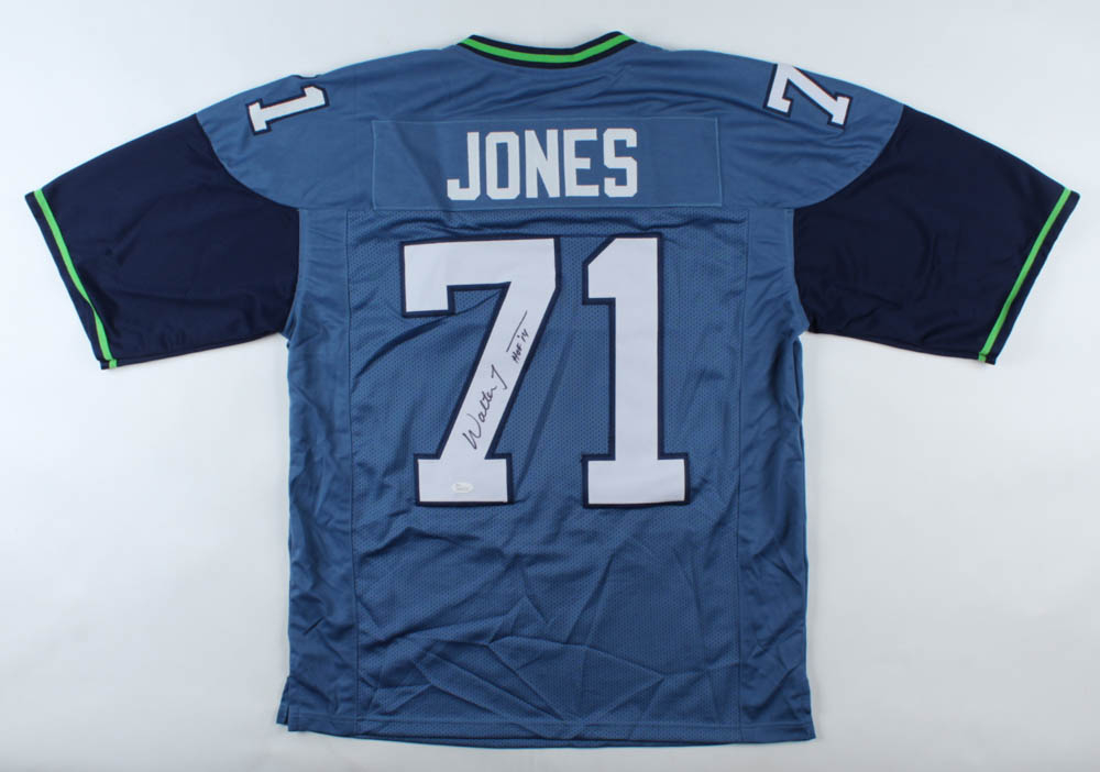 Custom on-field style jersey. Everything sewn on, size XL. Hand-signed by Walter Jones (HOF).