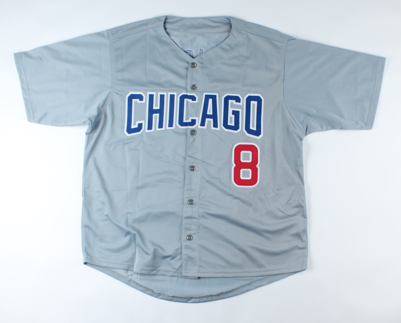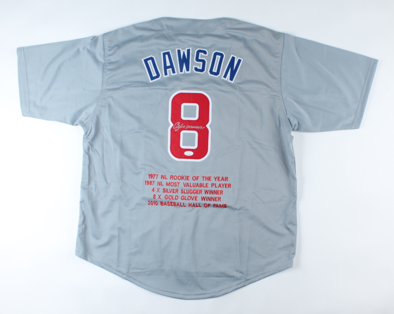 Custom on-field style jersey. Everything sewn on, size XL. Has been hand-signed by Andre Dawson (HOF). Dawson's career highlights have been custom stitched onto the back of the jersey below the reverse numbers.