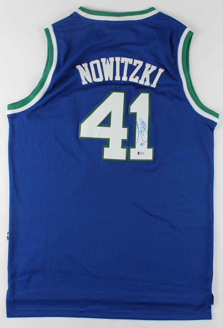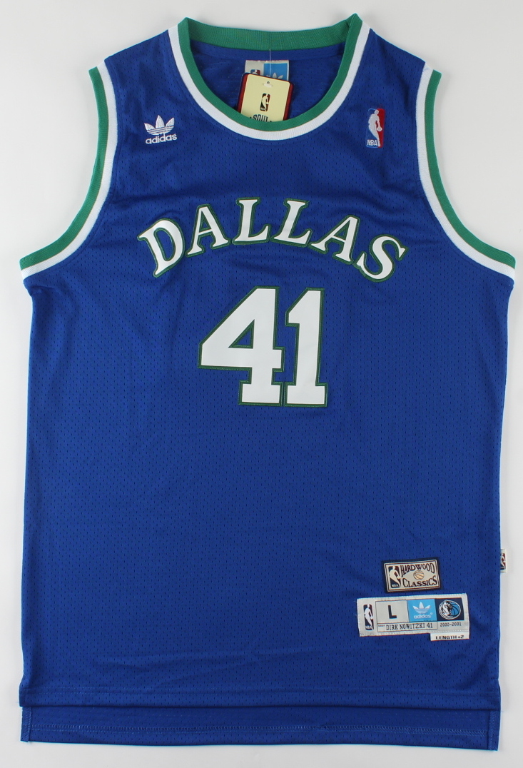 Adidas on-court style jersey. Everything sewn on, size L. Hand-signed by Dirk Nowitzki (Dallas Mavericks).