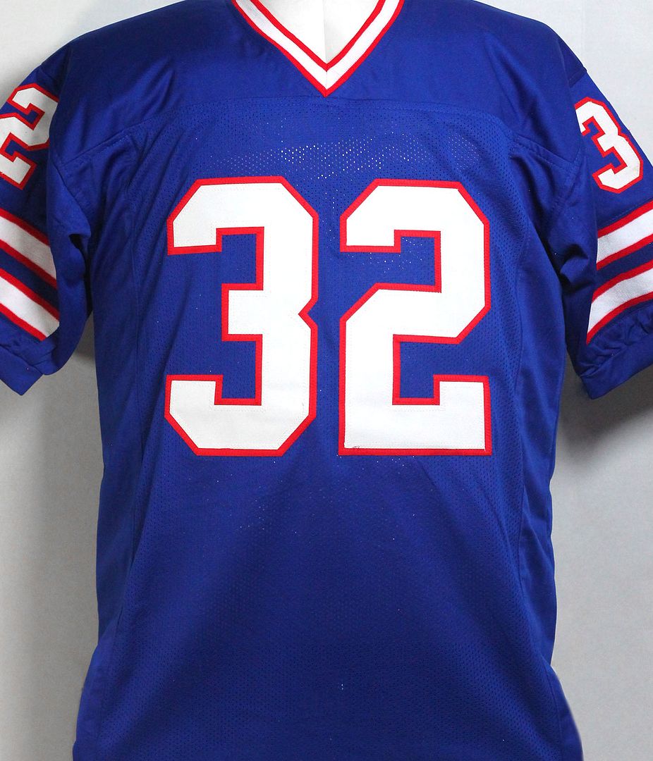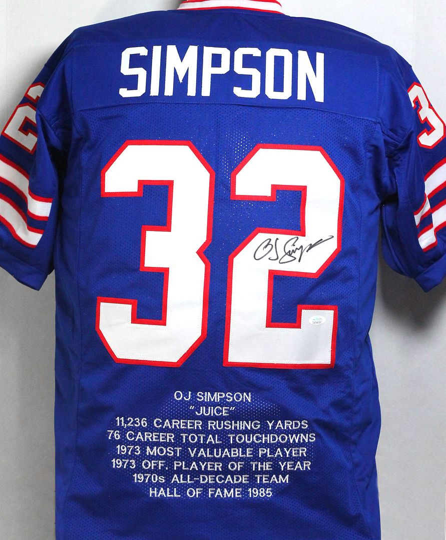 Custom on-field style jersey. Everything is sewn on, size XL. Has been hand-signed by O. J. Simpson (HOF). Simpson's career highlights have been custom stitched onto the back of the jersey below the reverse numbers.