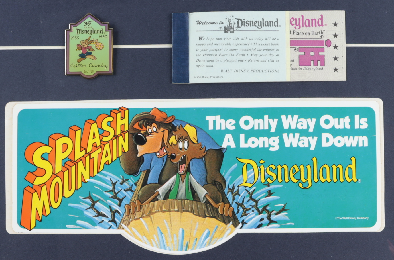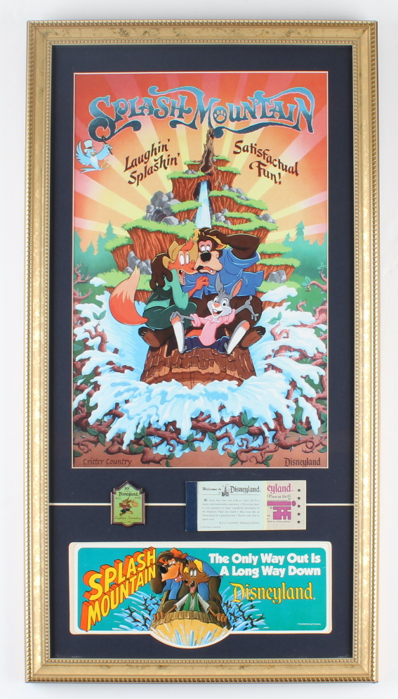 Disneyland "Splash Mountain" 15x27.5 Custom Framed Poster Display with Vintage Ticket Booklet, Souvenir Bumper Sticker, & Vintage Critter County Pin (See Description)