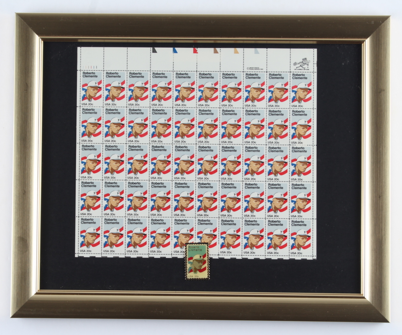 Custom frame measures approximately 13" x 16" in size and features an uncut sheet of (50) vintage Roberto Clemente (D.1972) stamps and an original metal stamp pin. Please see the photos for more information. Please note, the frame shows signs of handling.