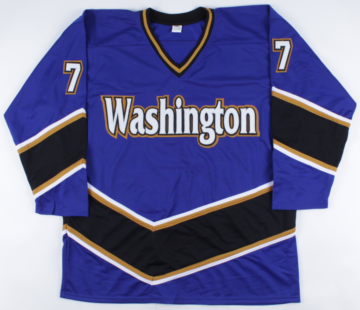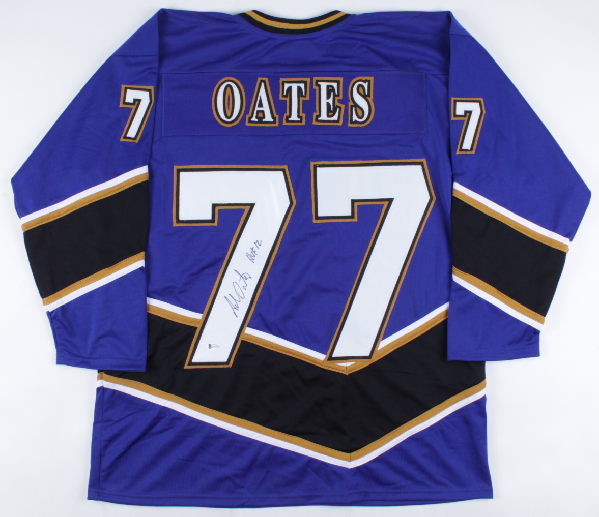 Custom on-ice style jersey. Everything is sewn on, size XL. Has been hand-signed by Adam Oates (HOF).