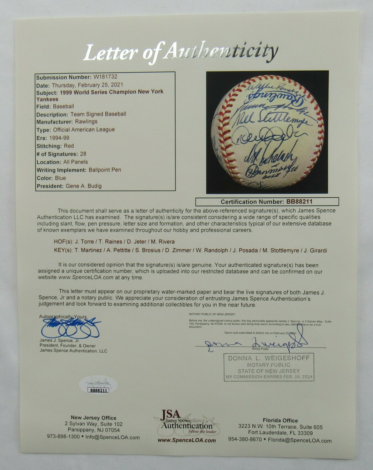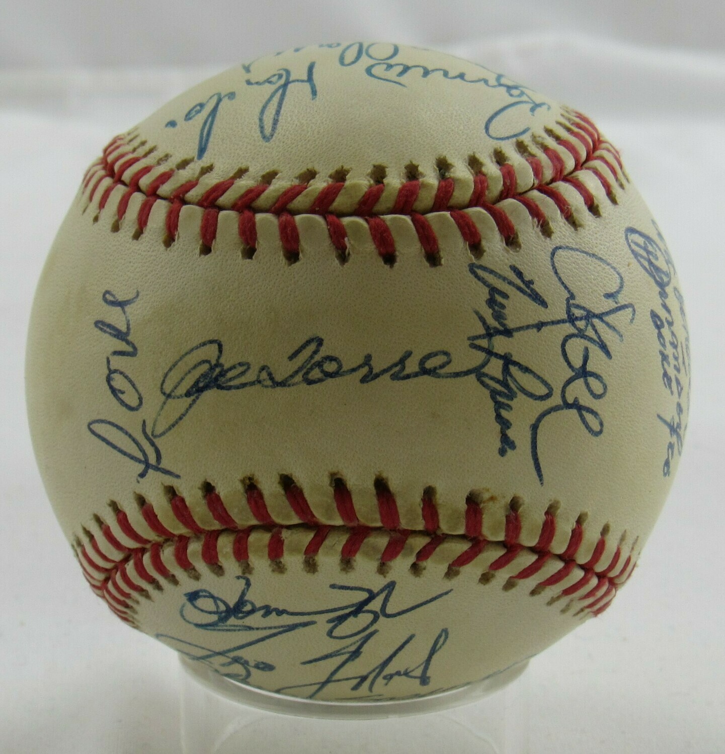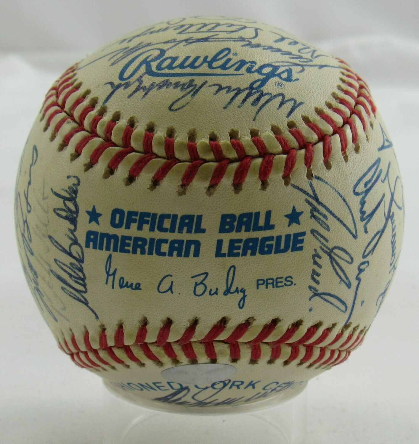 Rawlings Official American League baseball. Has been hand-signed by (28) members of the 1999 New York Yankees including Joe Torre, Willie Rudolph, Darren Holmes, Mel Stottlemyre, Derek Jeter, Jorge Posada, Orlando Hernandez, Chuck Knoblauch, Tim Raines, Don Zimmer, Jeff Nelson, Hideki Irabu, Paul O'Neill, Ramiro Mendoza, Graeme Lloyd, Jose Cardenal, Mariano Rivera, Chili Davis, Joe Girardi, Homer Bush, Tino Martinez, Shane Spencer, Mike Stanton, Ricky Ledee, Andy Pettitte, Scott Brosius, David Wells, and Mike Buddie.