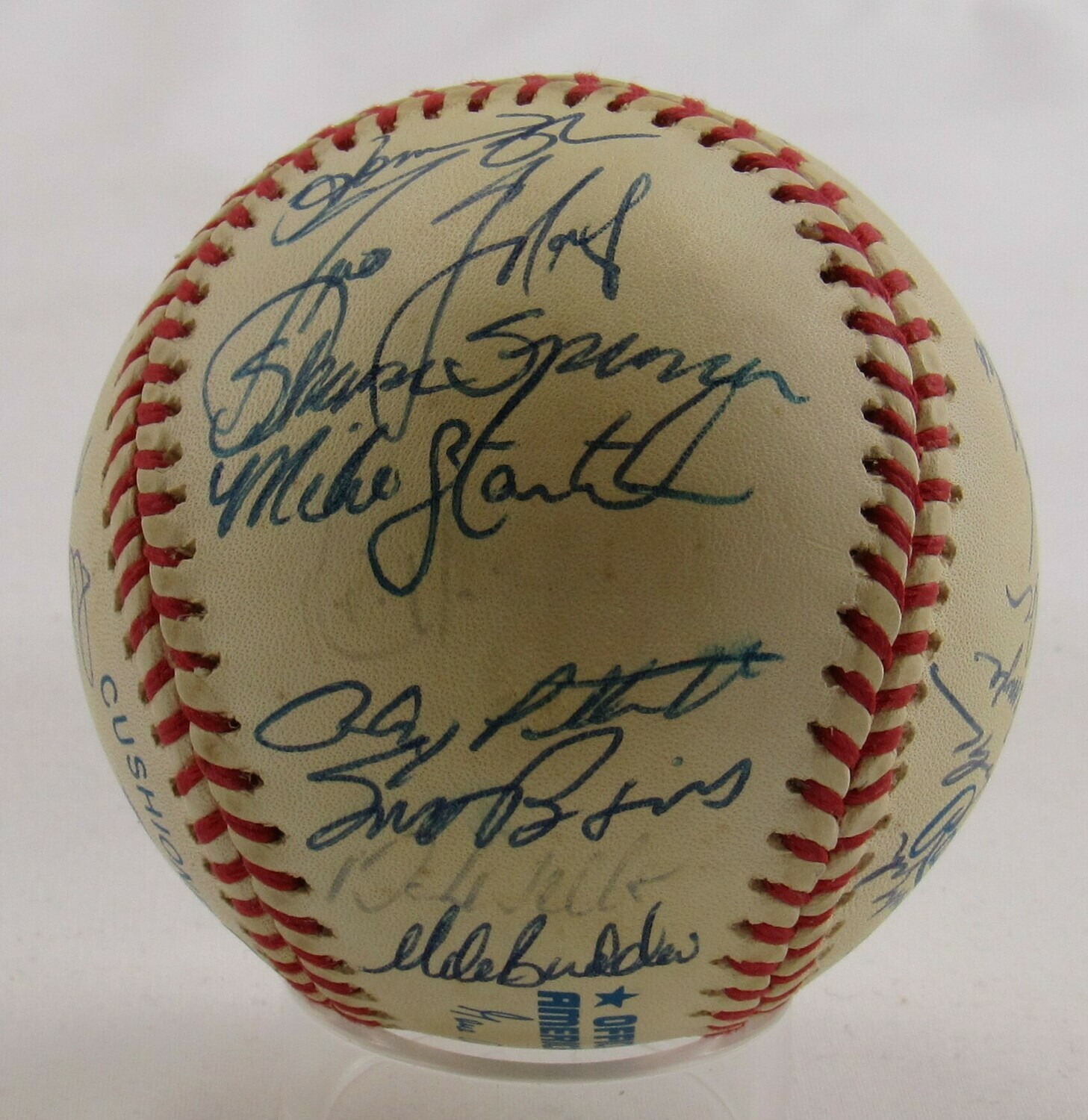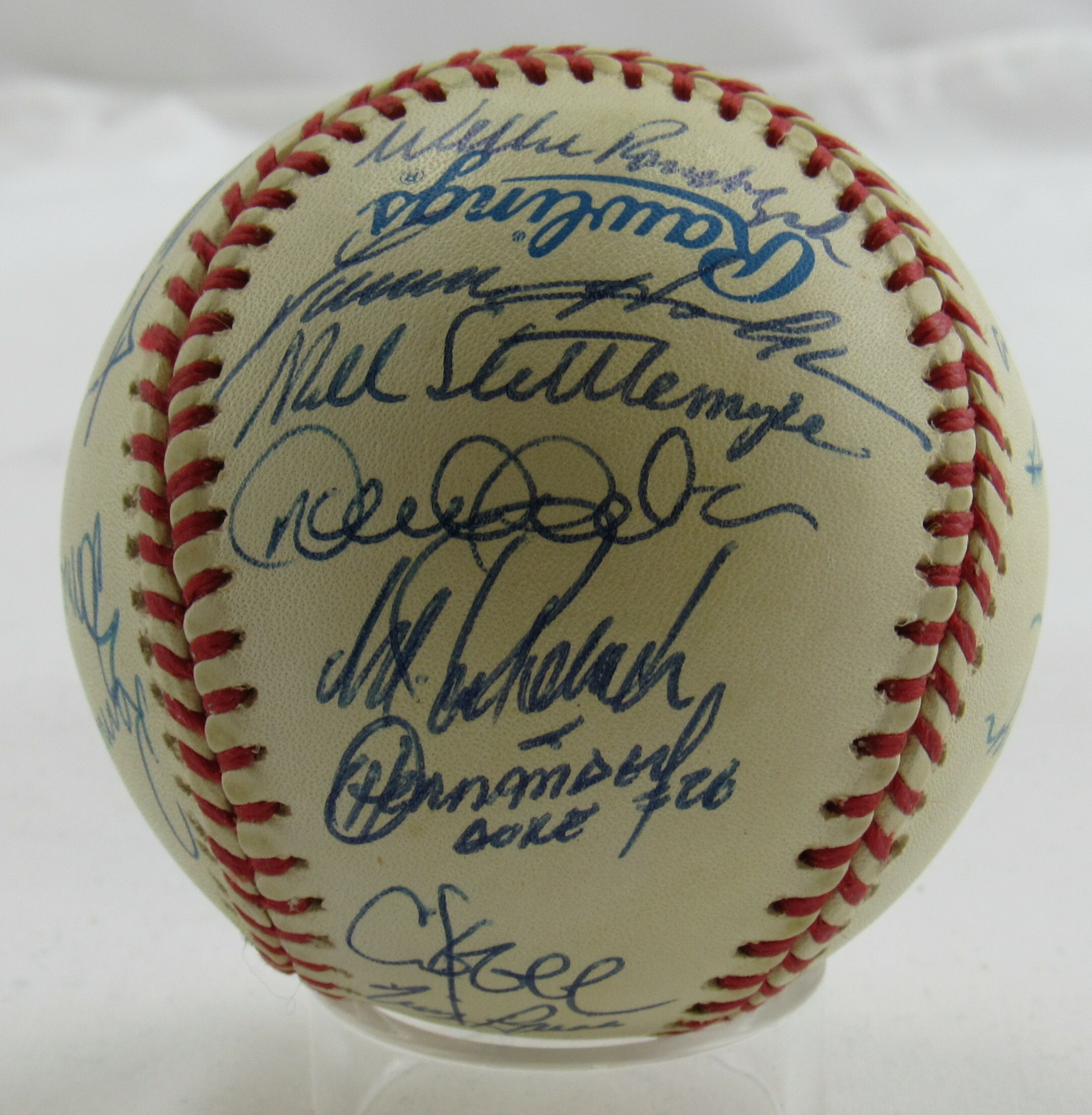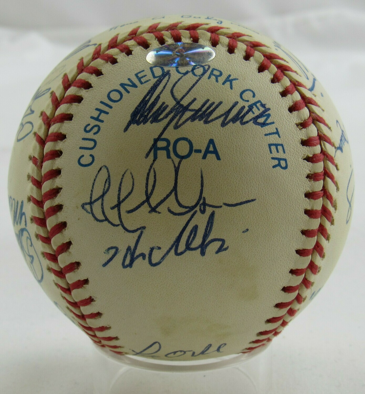 Rawlings Official American League baseball. Has been hand-signed by (28) members of the 1999 New York Yankees including Joe Torre, Willie Rudolph, Darren Holmes, Mel Stottlemyre, Derek Jeter, Jorge Posada, Orlando Hernandez, Chuck Knoblauch, Tim Raines, Don Zimmer, Jeff Nelson, Hideki Irabu, Paul O'Neill, Ramiro Mendoza, Graeme Lloyd, Jose Cardenal, Mariano Rivera, Chili Davis, Joe Girardi, Homer Bush, Tino Martinez, Shane Spencer, Mike Stanton, Ricky Ledee, Andy Pettitte, Scott Brosius, David Wells, and Mike Buddie.