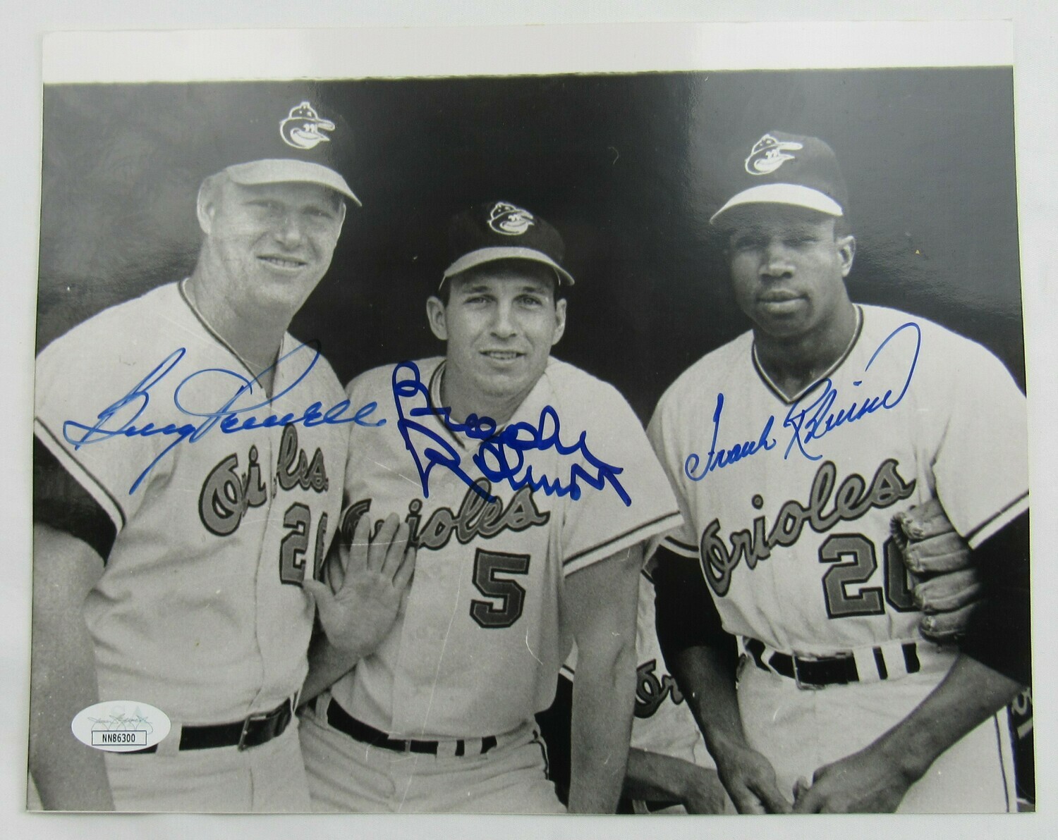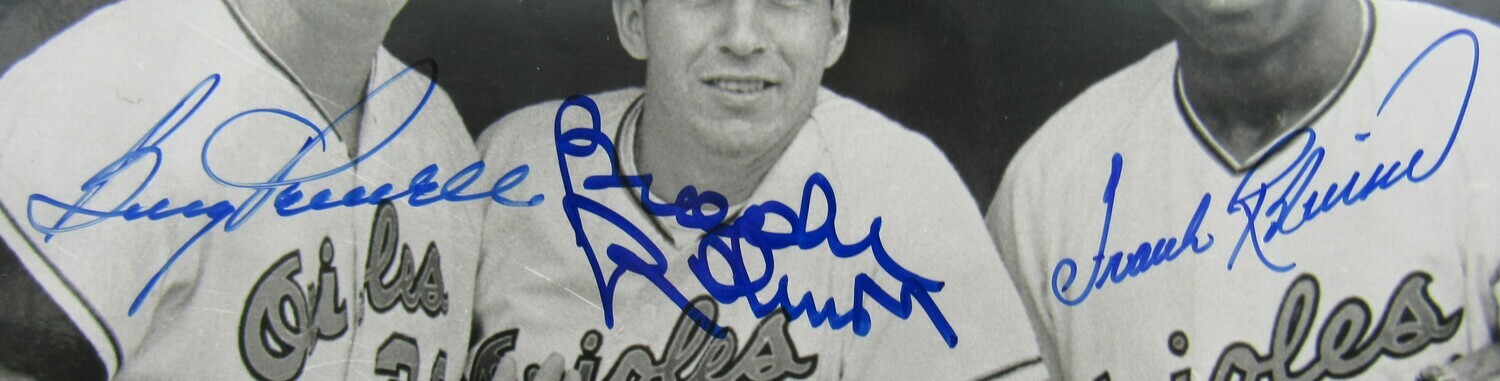 Photo measures 8" x 10" in size and has been hand-signed by Brooks Robinson (Baltimore Orioles, HOF), Frank Robinson (D. 2019, Baltimore Orioles, HOF) and Boog Powell (Baltimore Orioles).
