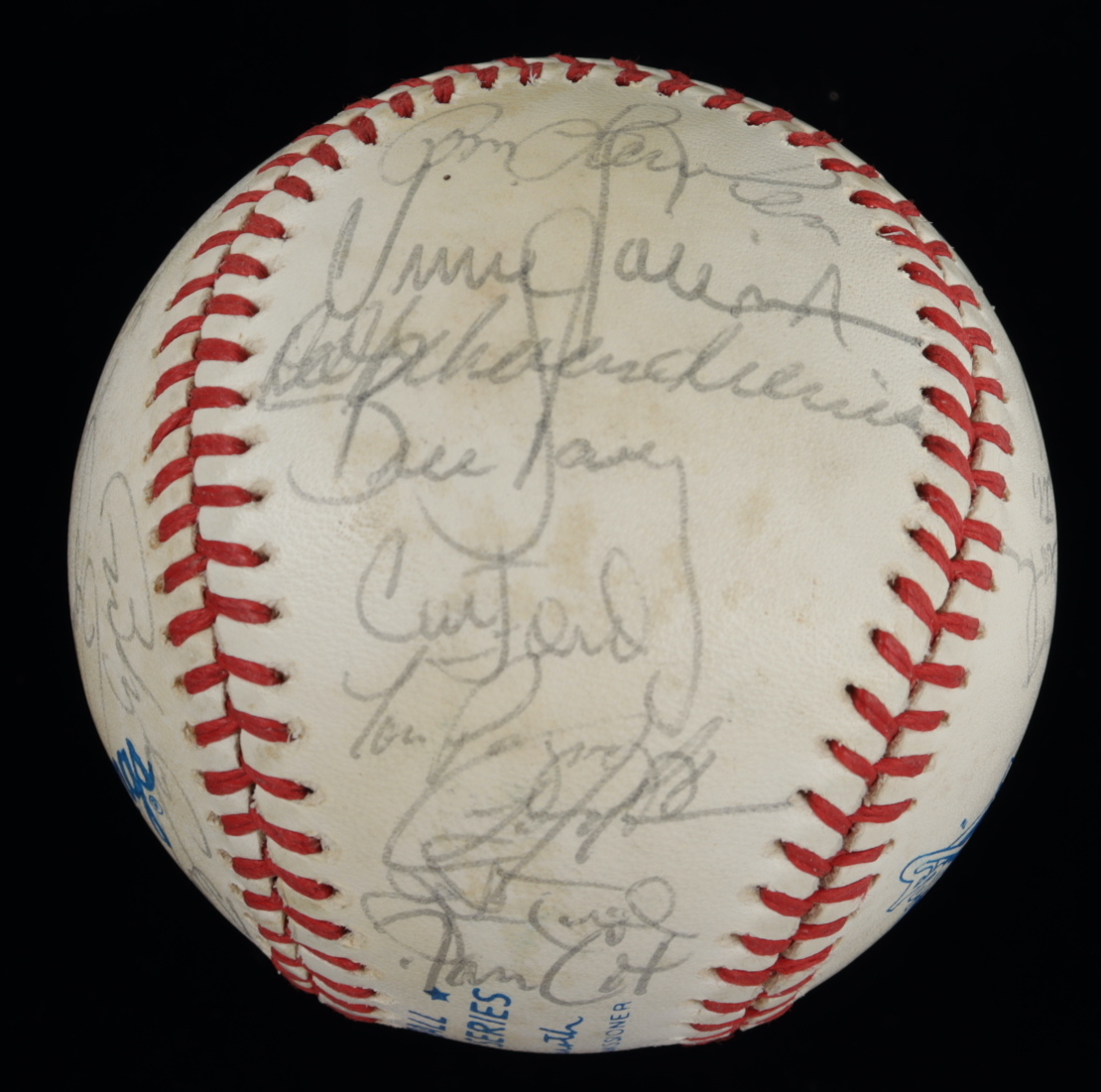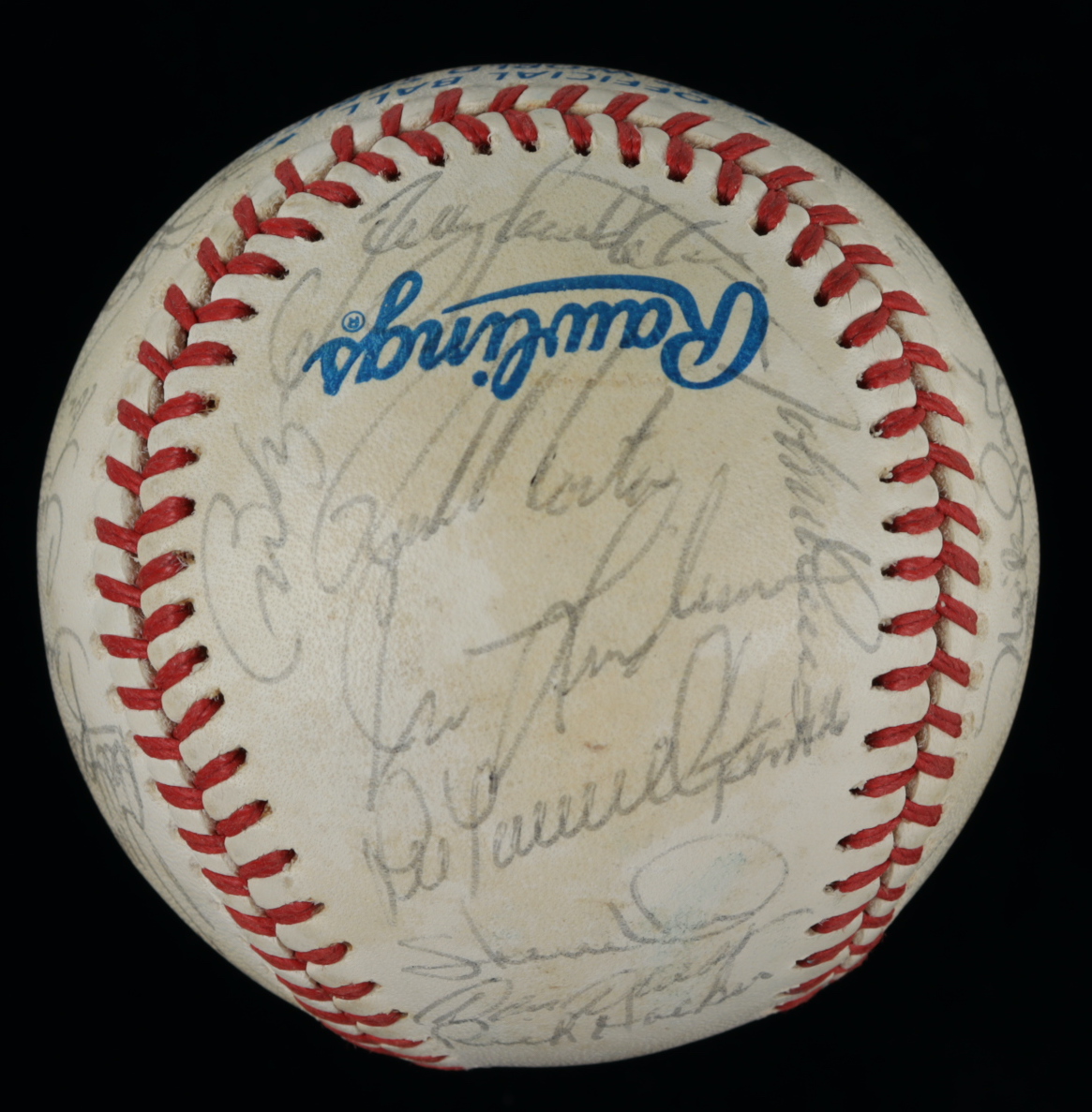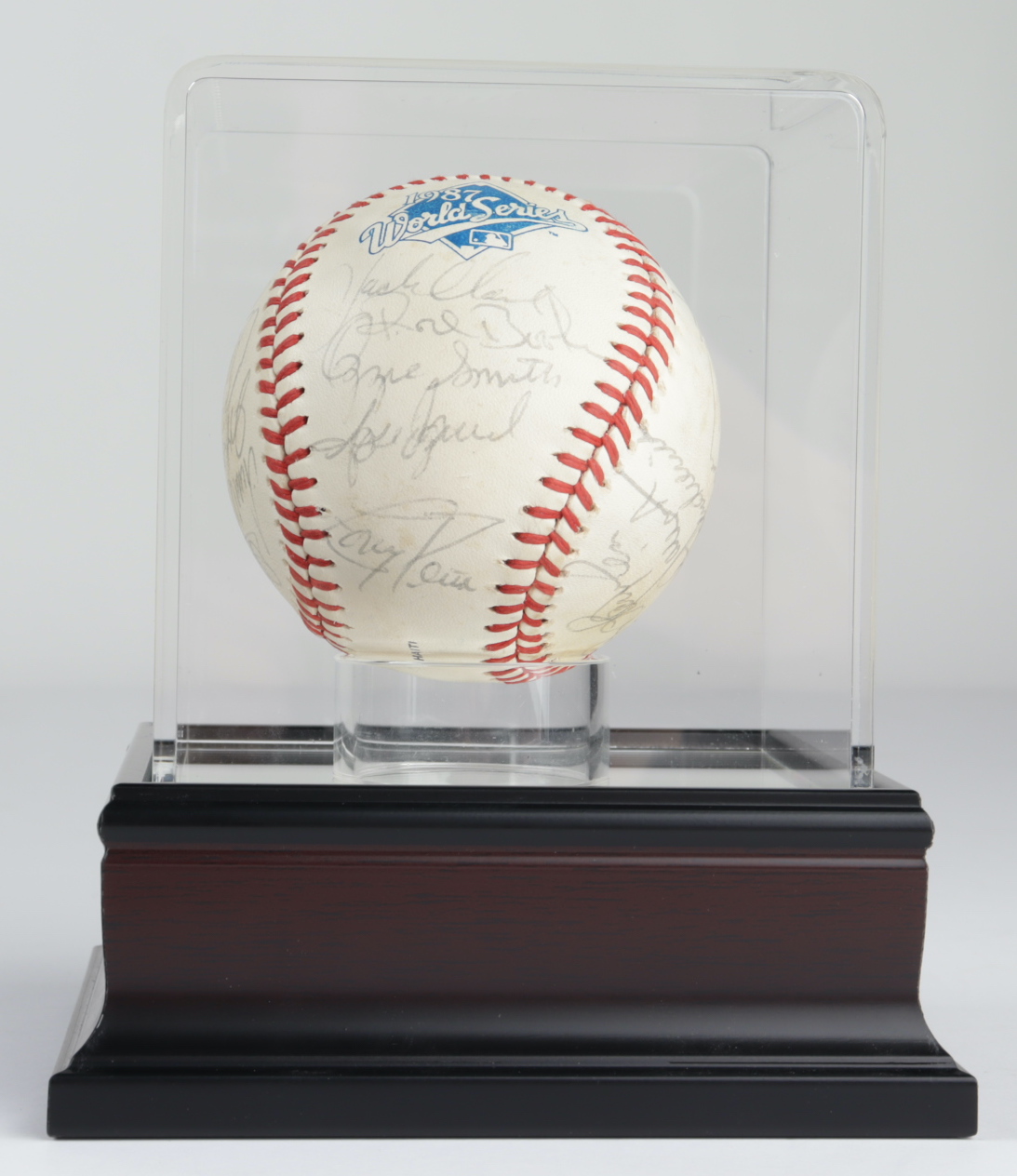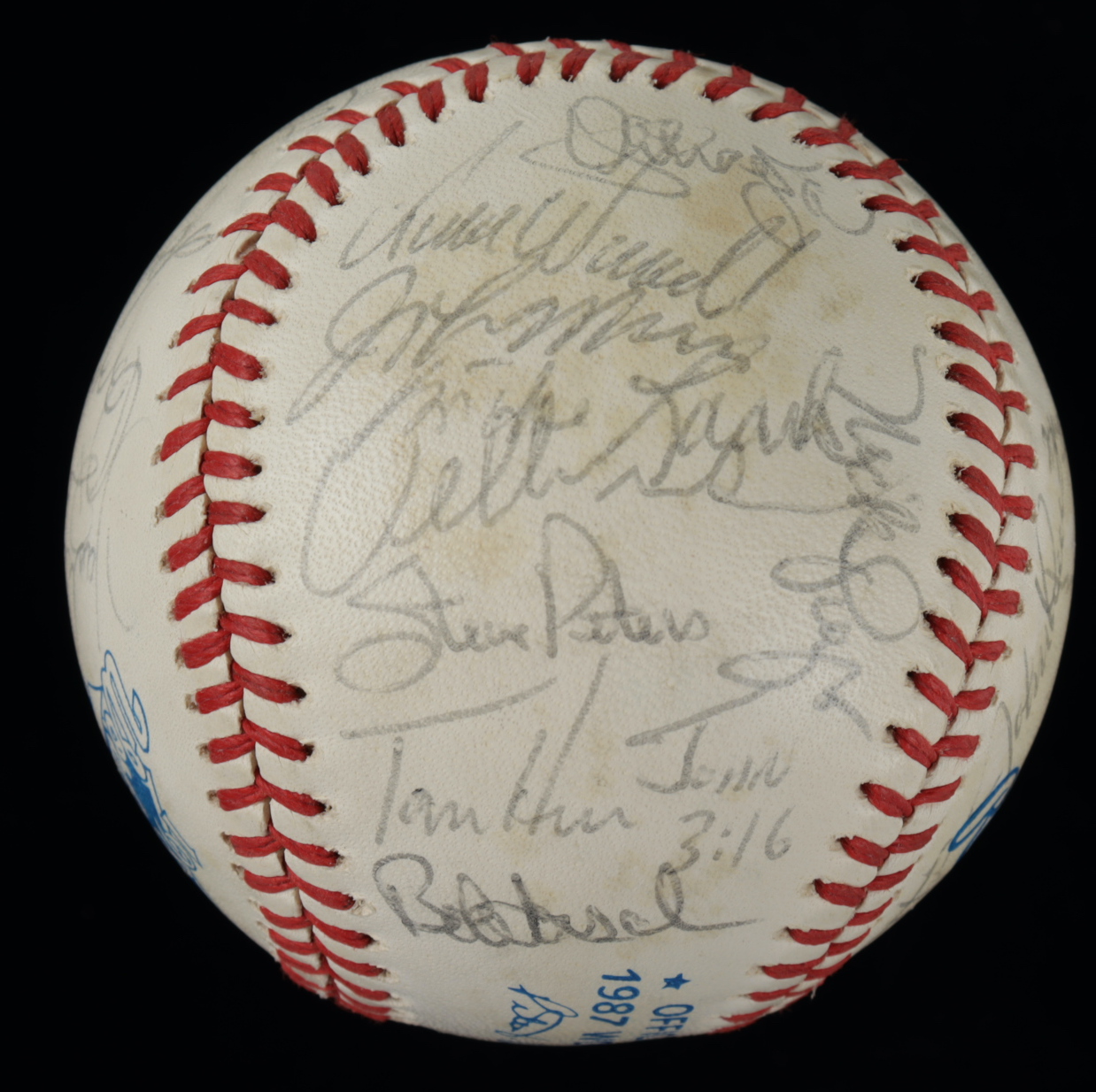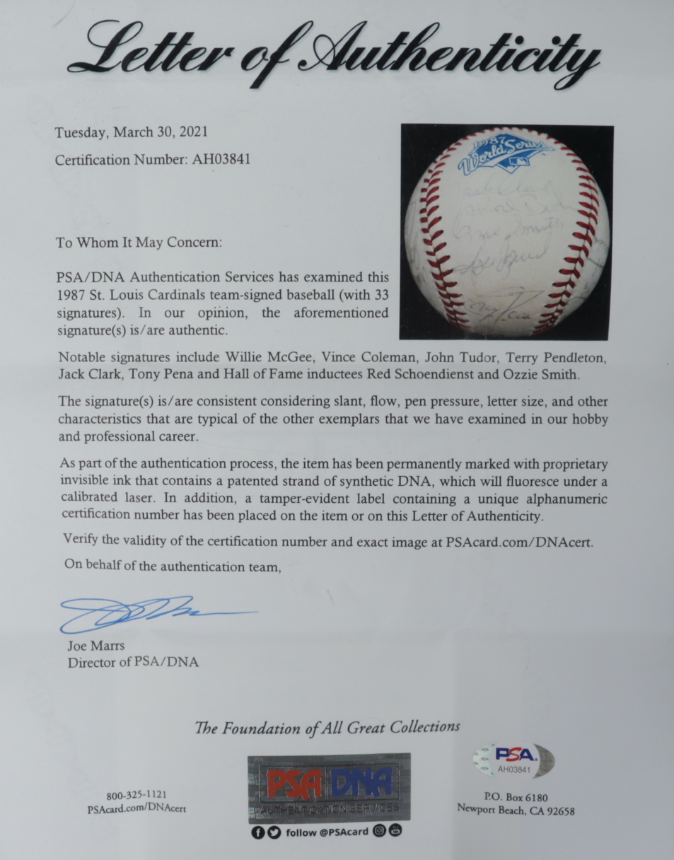 Rawlings Official 1987 World Series baseball has been hand-signed by (33) of the St. Louis Cardinals team with Willie McGee, Vince Coleman, John Tudor, Terry Pendleton, Jack Clark, Tony Pena, Red Schoendienst, Ozzie Smith, Tim Conroy, Danny Cox, Bill Dawley, Ken Dayley, Bob Forsch, Ricky Horton, Dave LaPoint, Joe Magrene, Greg Mathews, Randy O'Neal, Pat Perry, Steve Peters, Ray Soff, Scott Terry, Lee Tunnell, Todd Worrell, Steve Lake, Tom Pagnozzi, Tony Pena, and (6) others. Includes display case as shown.