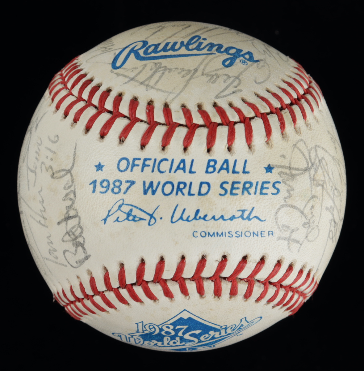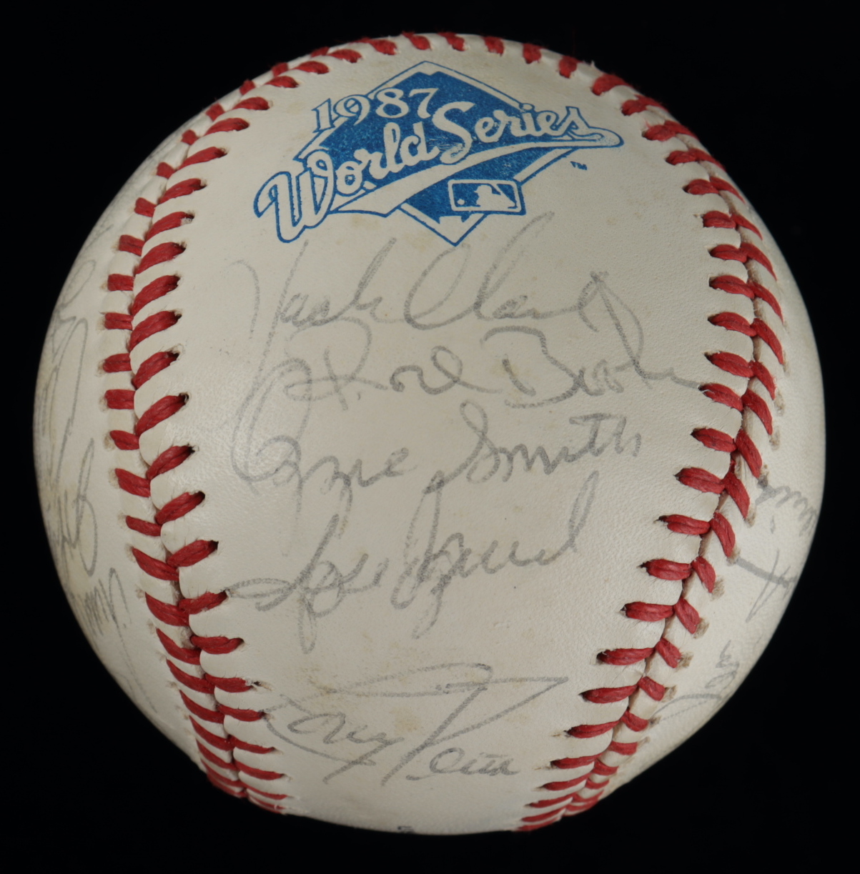 Official 1987 World Series Baseball with Display Case Signed by (33) with Willie McGee, Vince Coleman, John Tudor, Terry Pendleton, Jack Clark, Tony Pena, Red Schoendienst, Ozzie Smith (PSA LOA)