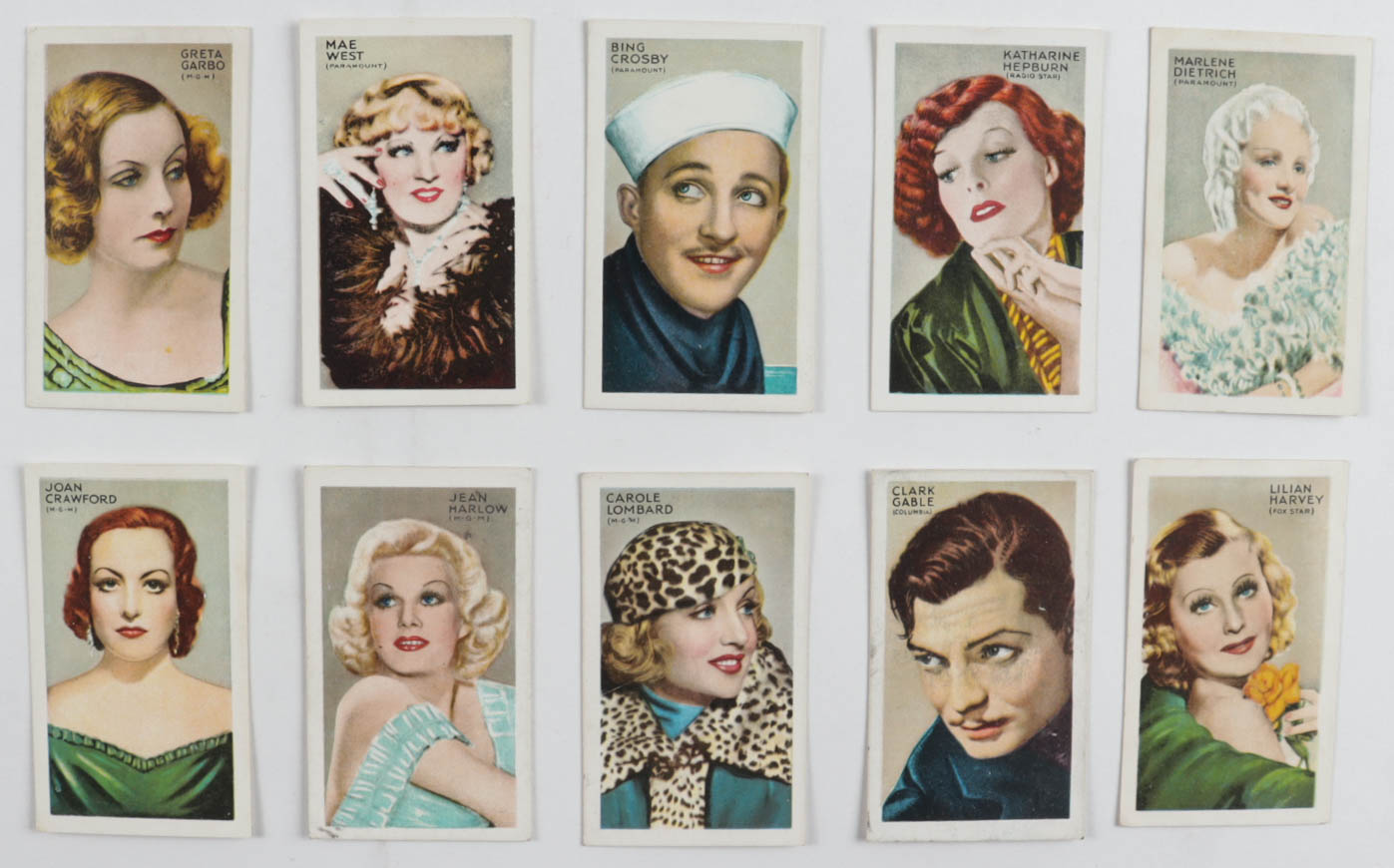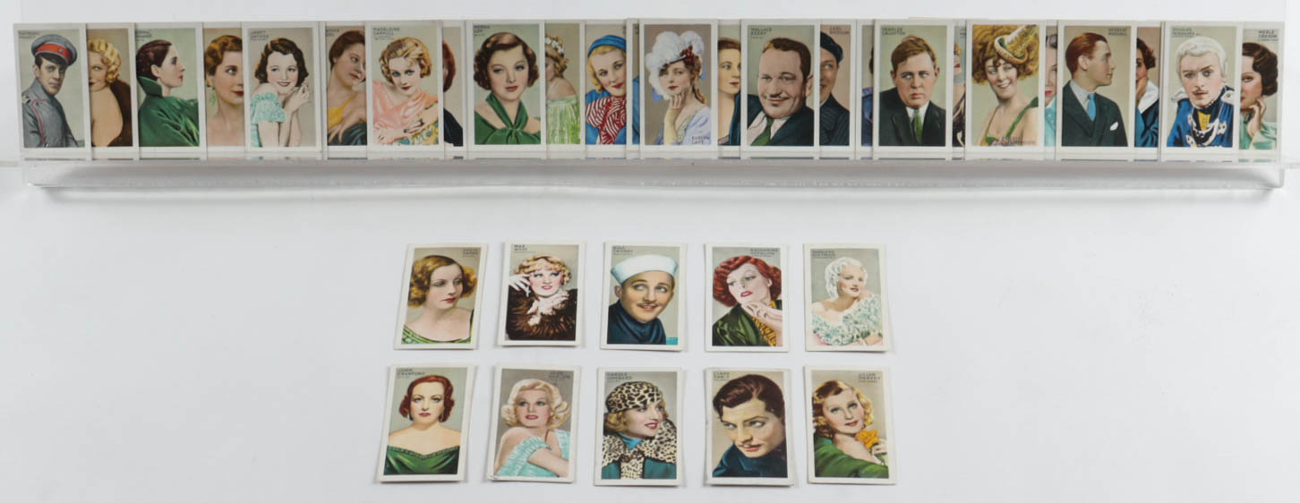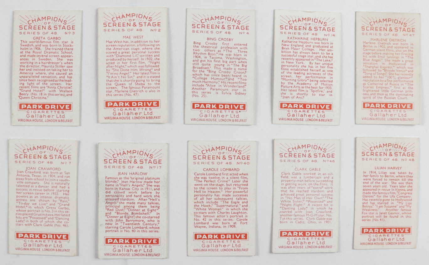 1934 Gallaher "Champions of Stage & Screen" Complete Set of (48) Cigarette Cards with #46 Clark Gable, #48 Lillian Harvey, #7 Joan Crawford, #17 Jean Harlow, #4 Bing Crosby, #47 Marlene Dietrich, #14 Katharine Hapburn