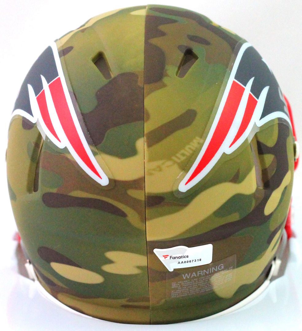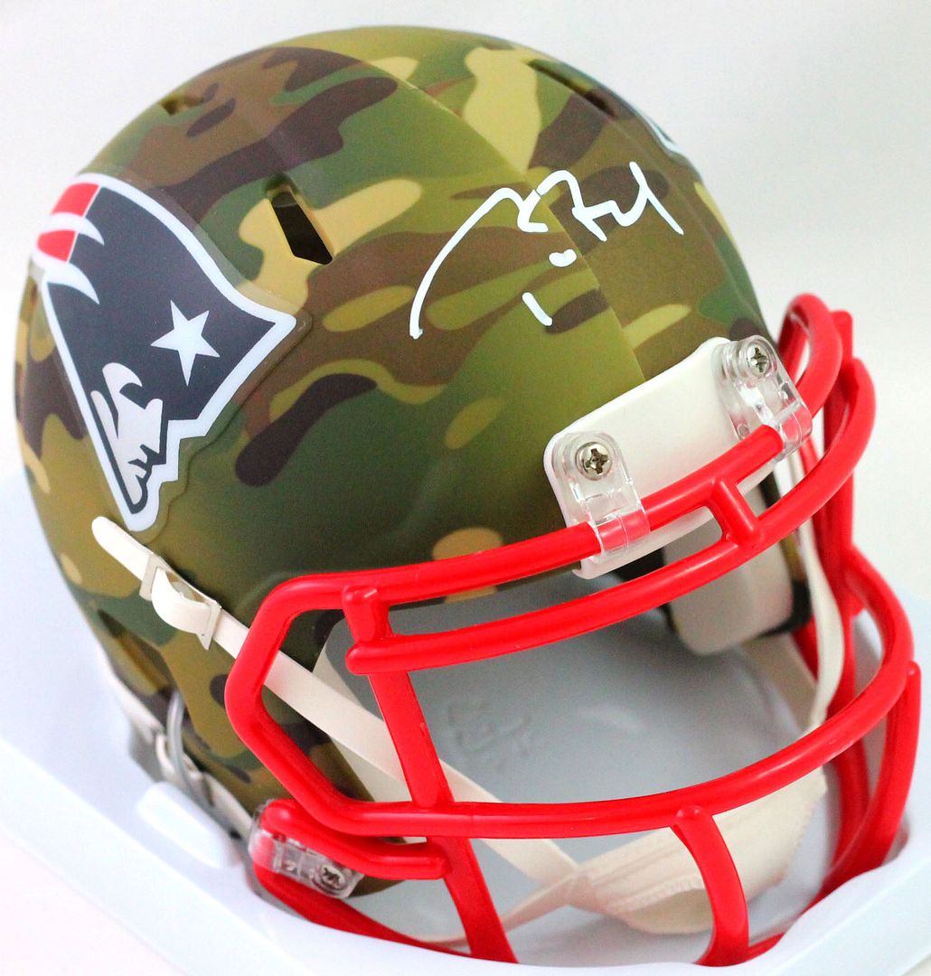 Riddell New England Patriots Camo Alternate Speed Mini Helmet has been hand-signed by Tom Brady.