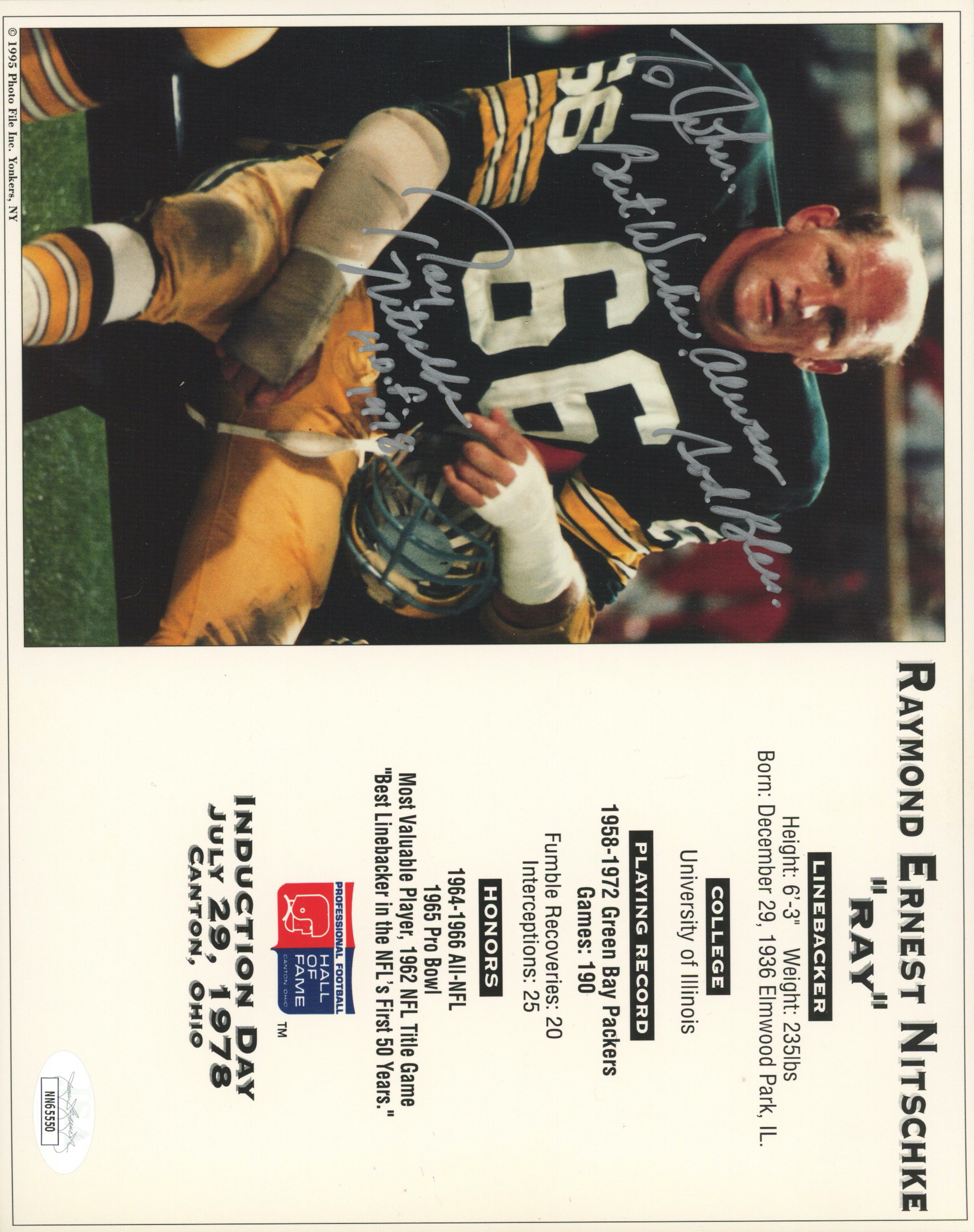 Photo measures 8" x 10" in size and has been hand-signed by Ray Nitschke (Green Bay Packers, HOF). Please note, photo is personalized "To John".