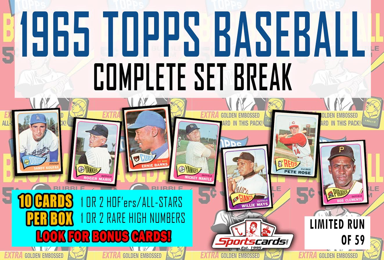 This 1965 Topps Baseball Set break mystery box has 10 Cards and GUARANTEES YOU GET at least 1 Hall of Famer/All Star card and 1 or more Rare High Number/SPs.