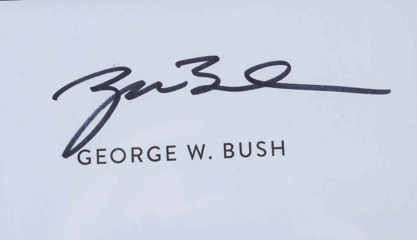 Custom framed display measures approximately 16" x 25" in size and features a cut that is hand-signed by George W. Bush.
