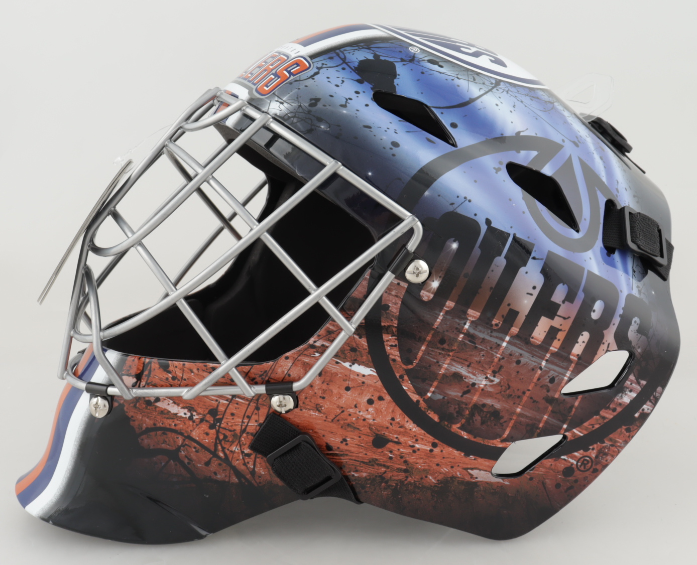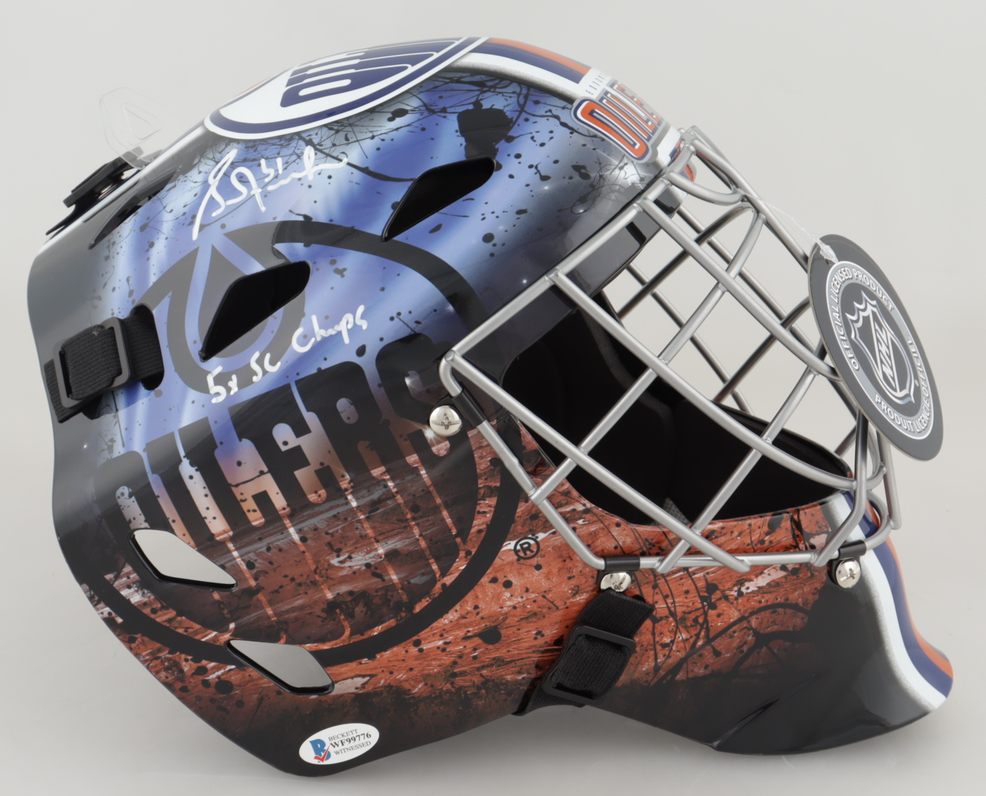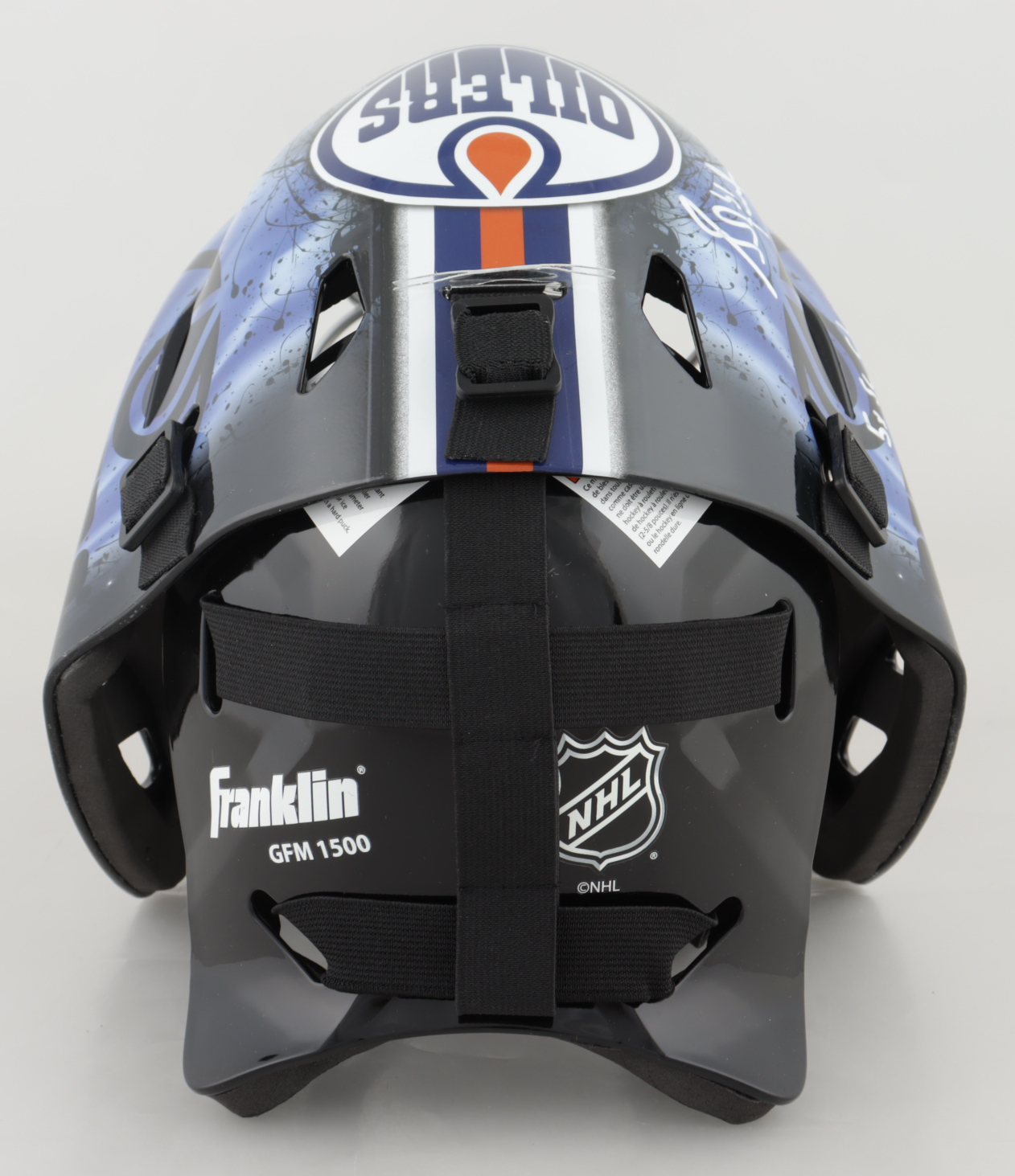 Franklin Edmonton Oilers full-size replica goalie mask has been hand-signed and inscribed by Grant Fuhr (HOF).