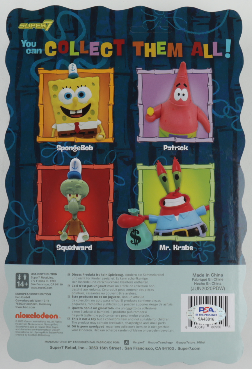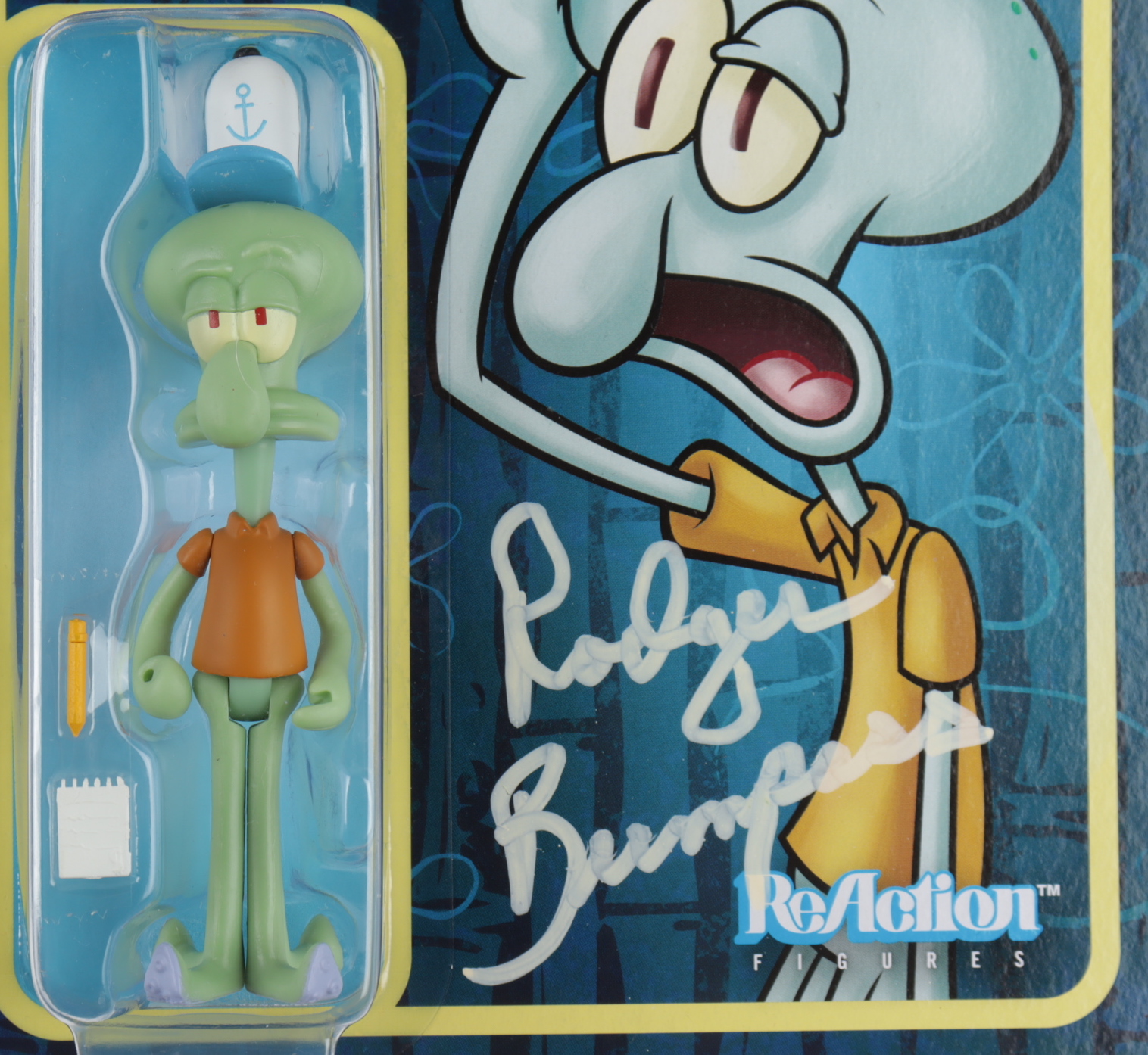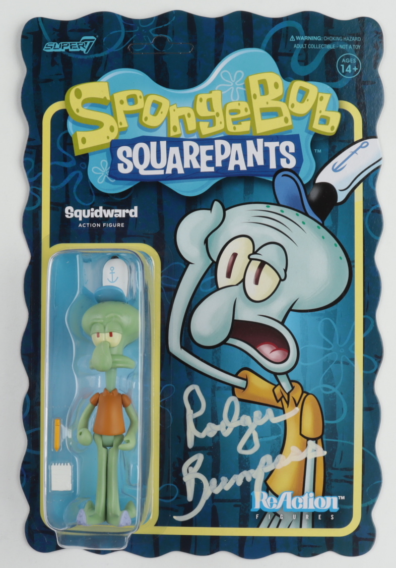 Nickelodeon ReAction "Spongebob Squarepants" Squidward Tentacles action figure measures approximately 5" in height and has been hand-signed on the packaging by Rodger Bumpass (Voice of Squidward Tentacles).