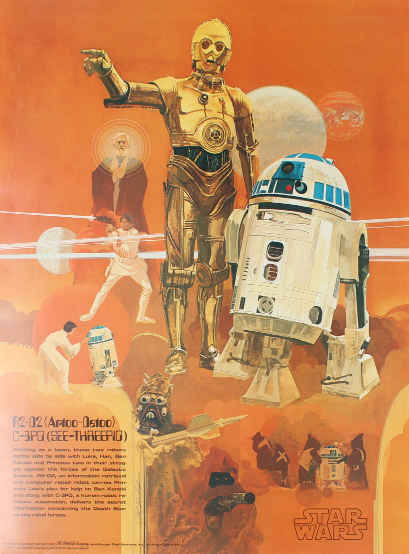 Vintage 1977 Coca-Cola Star Wars Poster featuring C-3PO and R2-D2 measures 18" x 24" in size. Please note, the poster shows signs of wear along the edges.