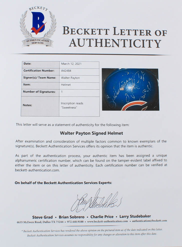 Walter Payton Signed Bears Full-Size Authentic On-Field Helmet Inscribed "Sweetness" (Beckett LOA) (See Description)