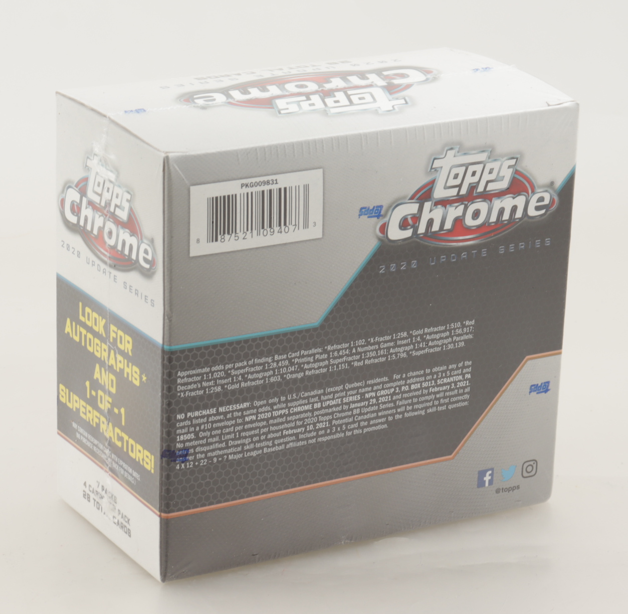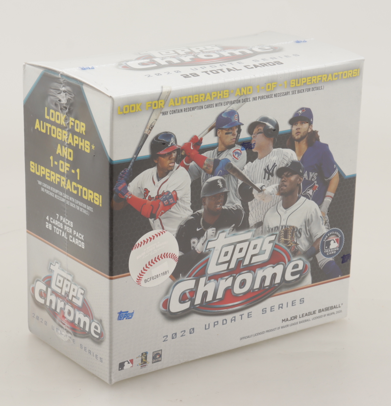 Topps presents the MLB 2020 Chrome Update series mega box. Each box contains 7 packs per box, and each pack contains 4 cards per pack for a grand total of 28 MLB trading cards per box.