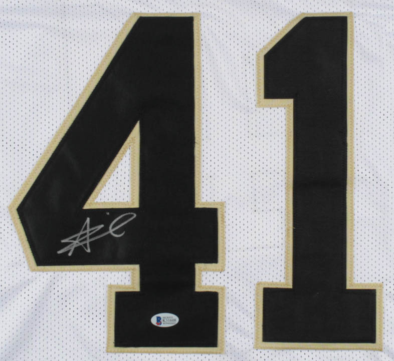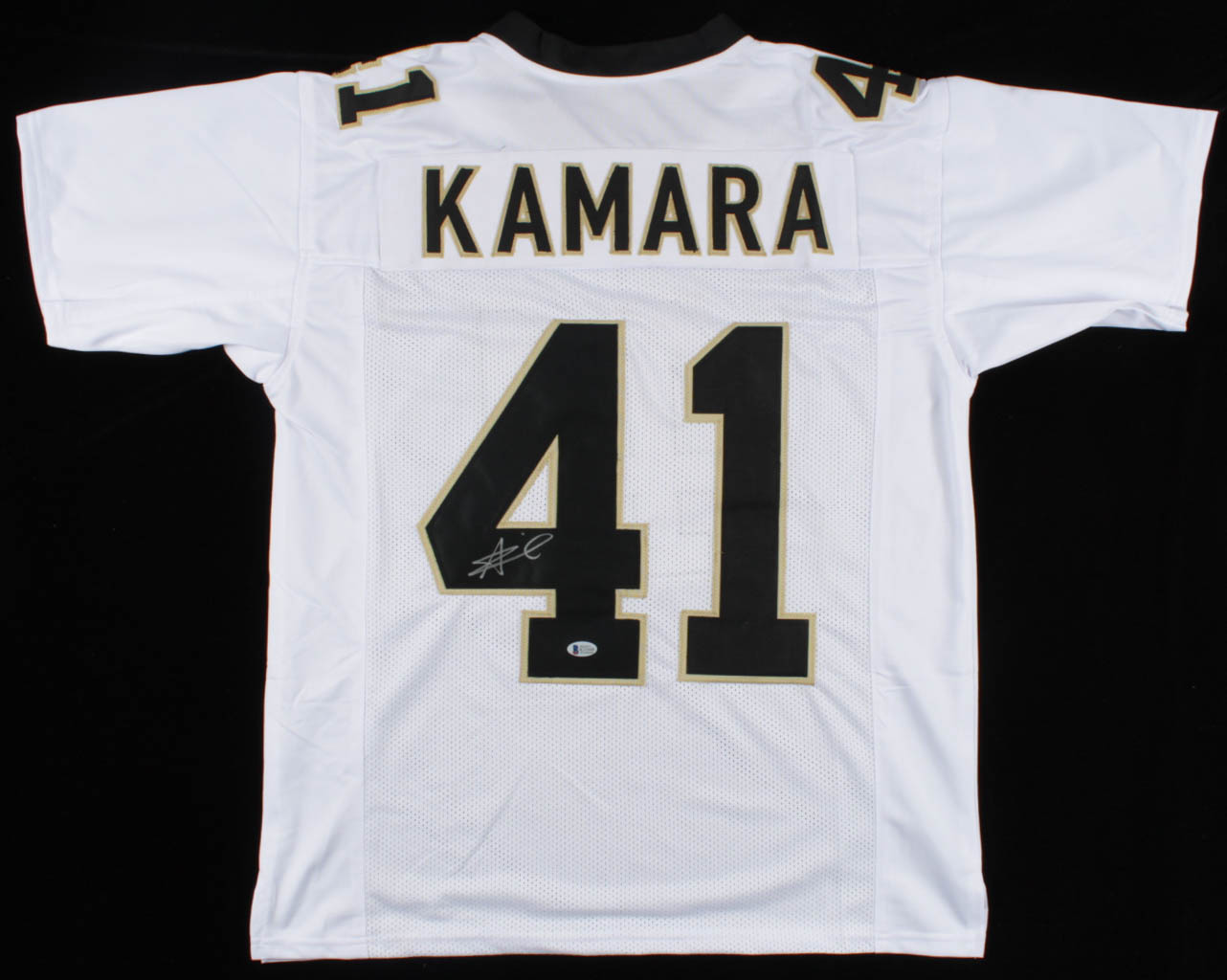 Custom on-field style jersey. Everything is sewn on, size XL. Hand-signed by Alvin Kamara.
