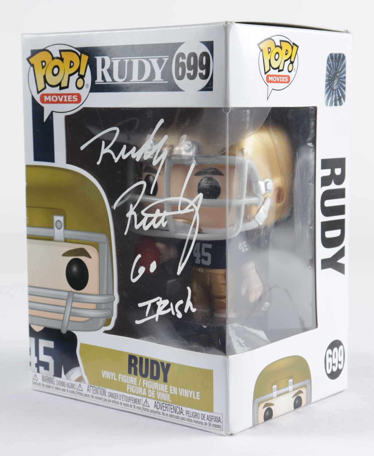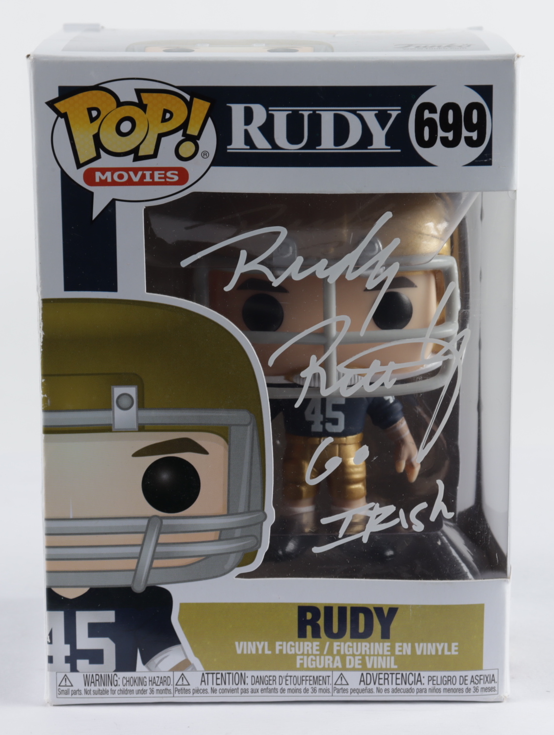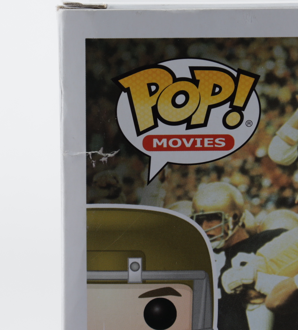 Funko Pop! figure measures approximately 4" tall and has been hand-signed on the packaging by Rudy Ruettiger (Notre Dame Fighting Irish).