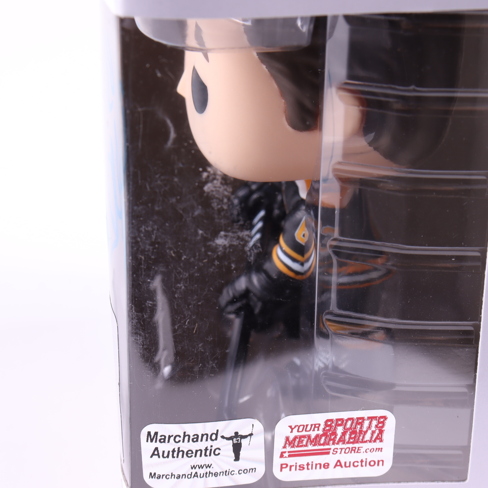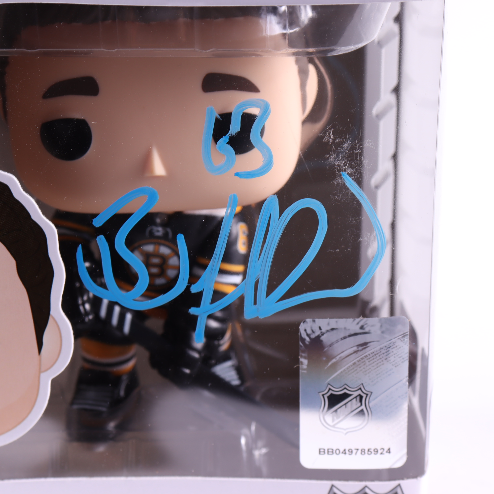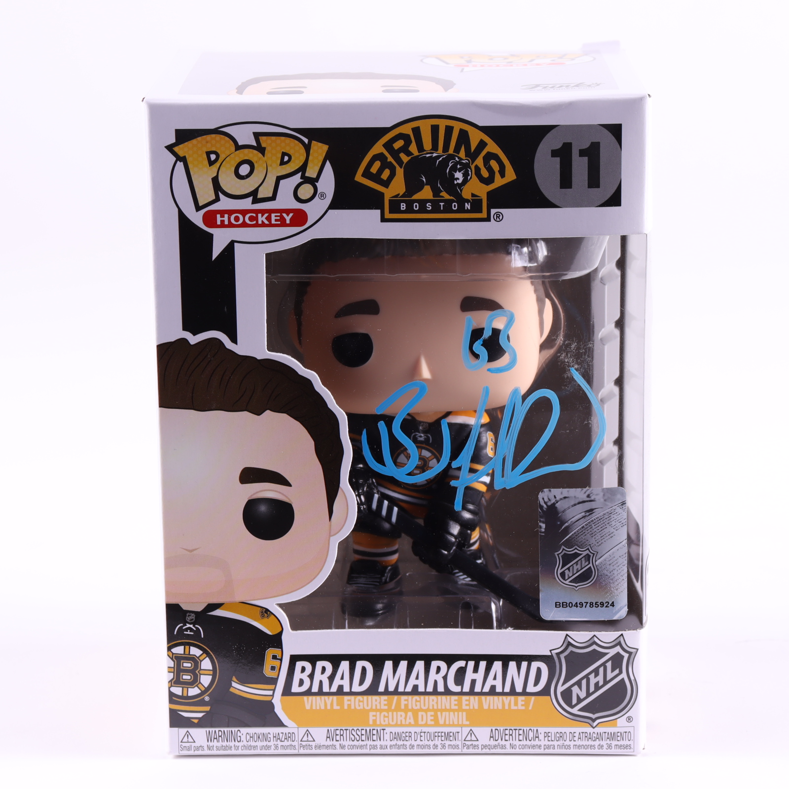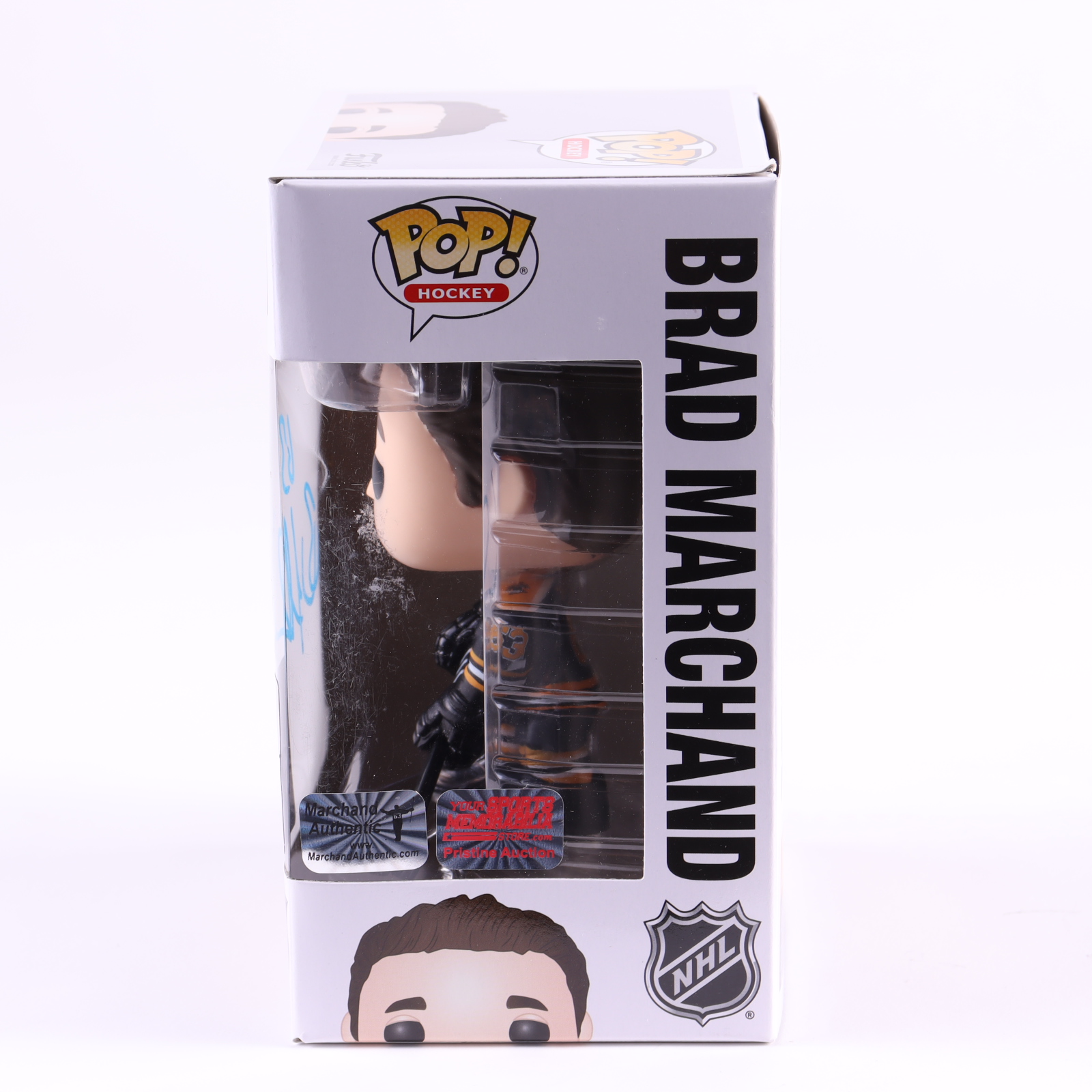 Funko Pop! vinyl figure measures approximately 4" tall and has been hand-signed on the packaging by Brad Marchand (Boston Bruins).
