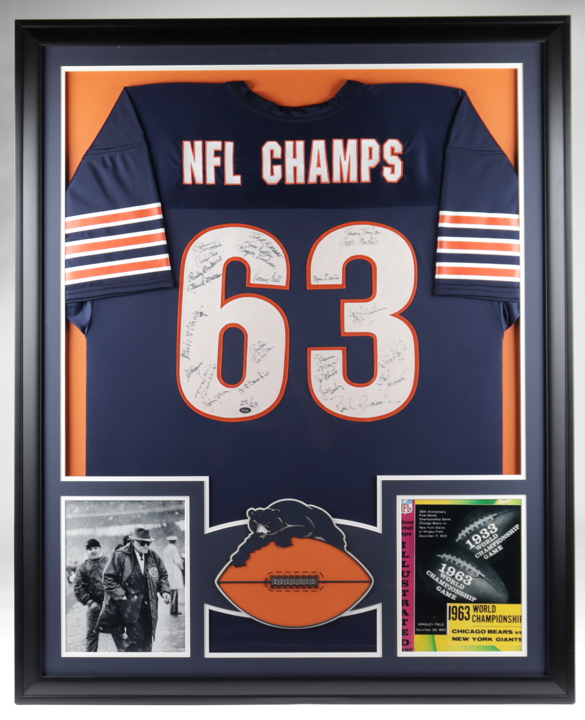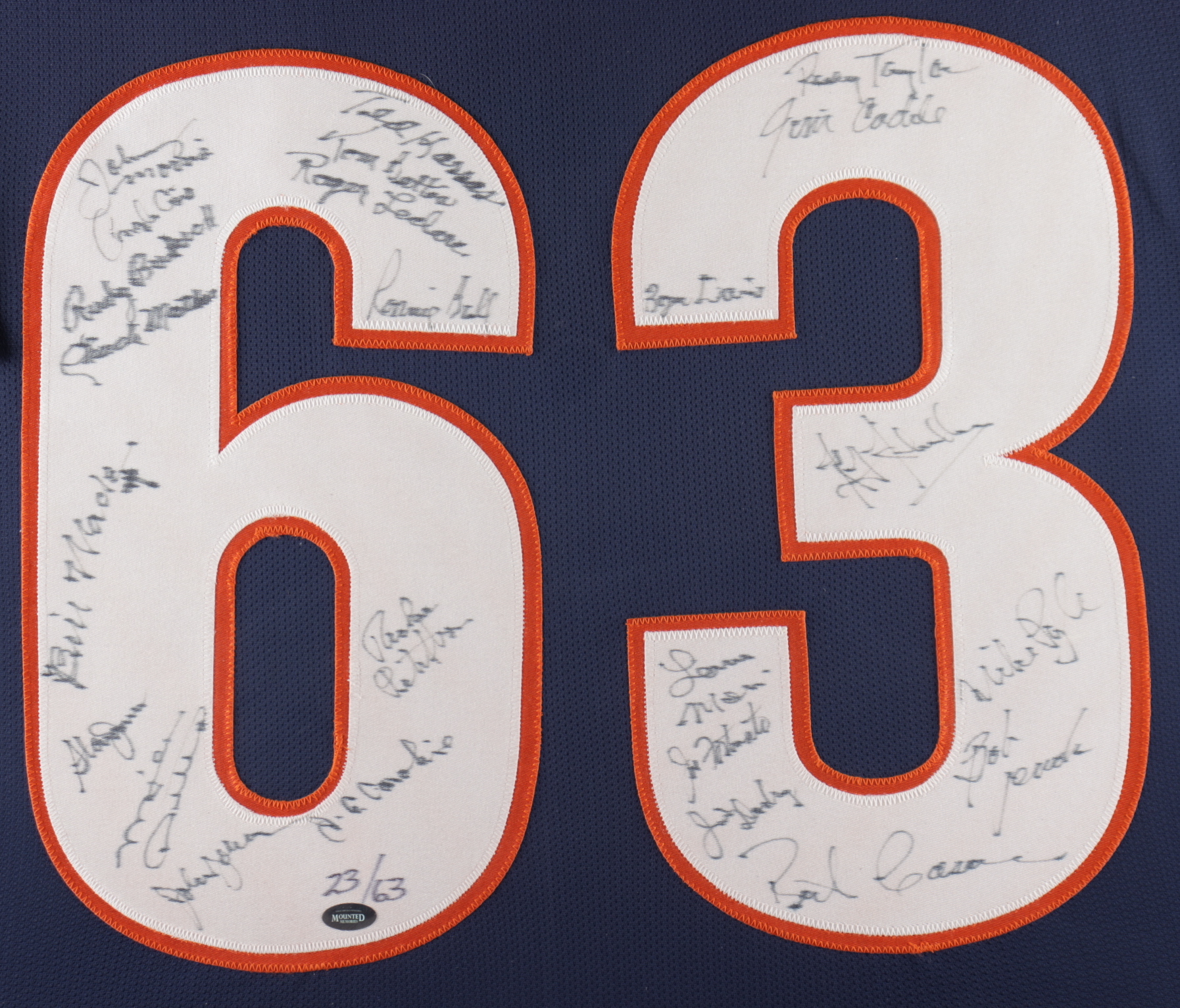 Custom frame measures 35" x 43" in size and features a jersey that has been hand-signed by Mike Ditka, Rosey Taylor, Johnny Morris, Ronnie Bull, Rudy Bukich, Billy Wade, Jim Cadile and (15) others.