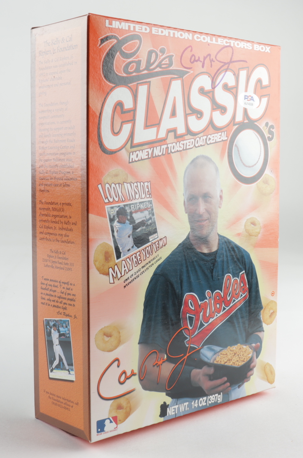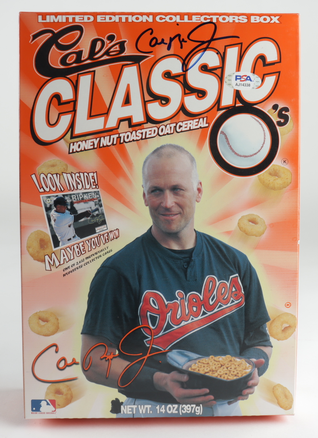 "Cal's Classic" Cereal Box has been hand-signed by Cal Ripken Jr. (Baltimore Orioles, HOF). Please note, the top of the box shows some wear.