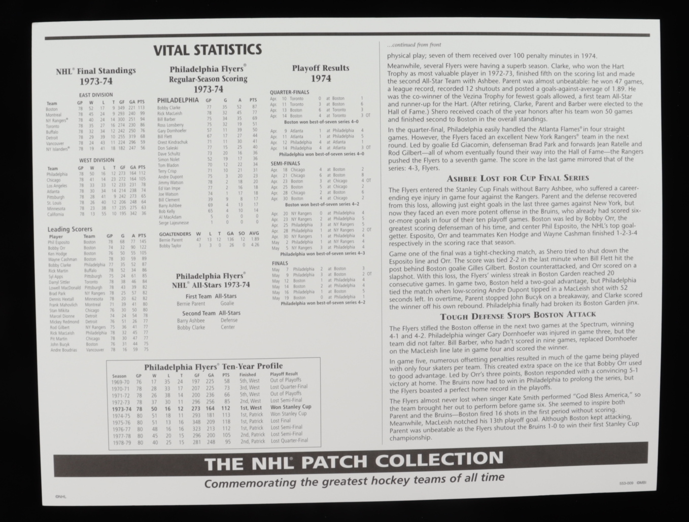 1974 Philadelphia Flyers "The NHL Patch Collections" statistics commemorative print measures approximately 10" x 14" in size.