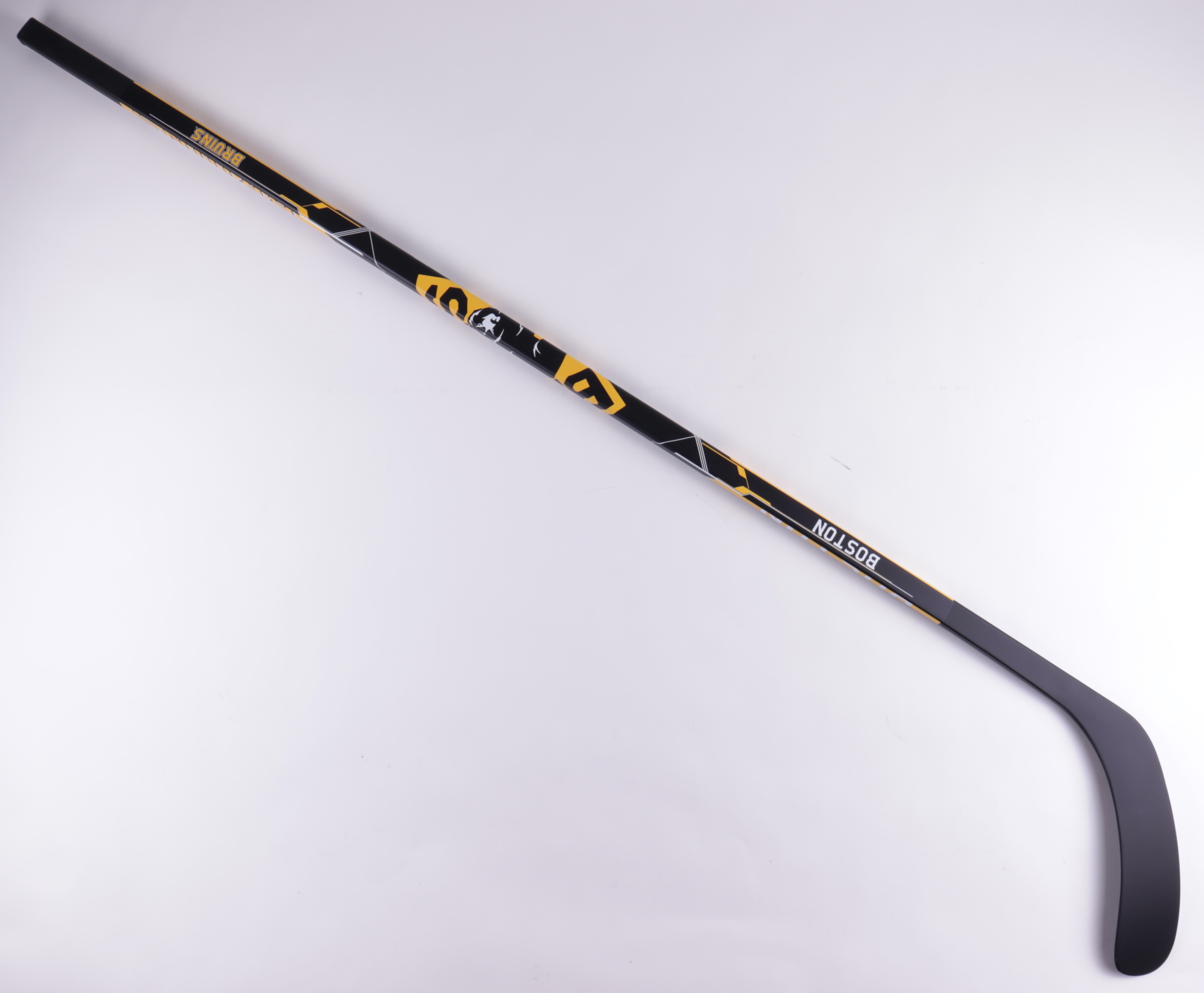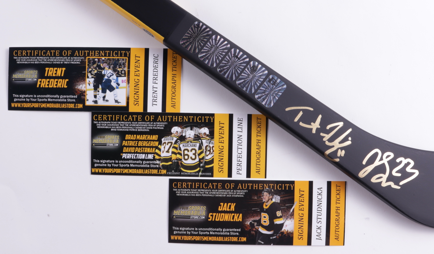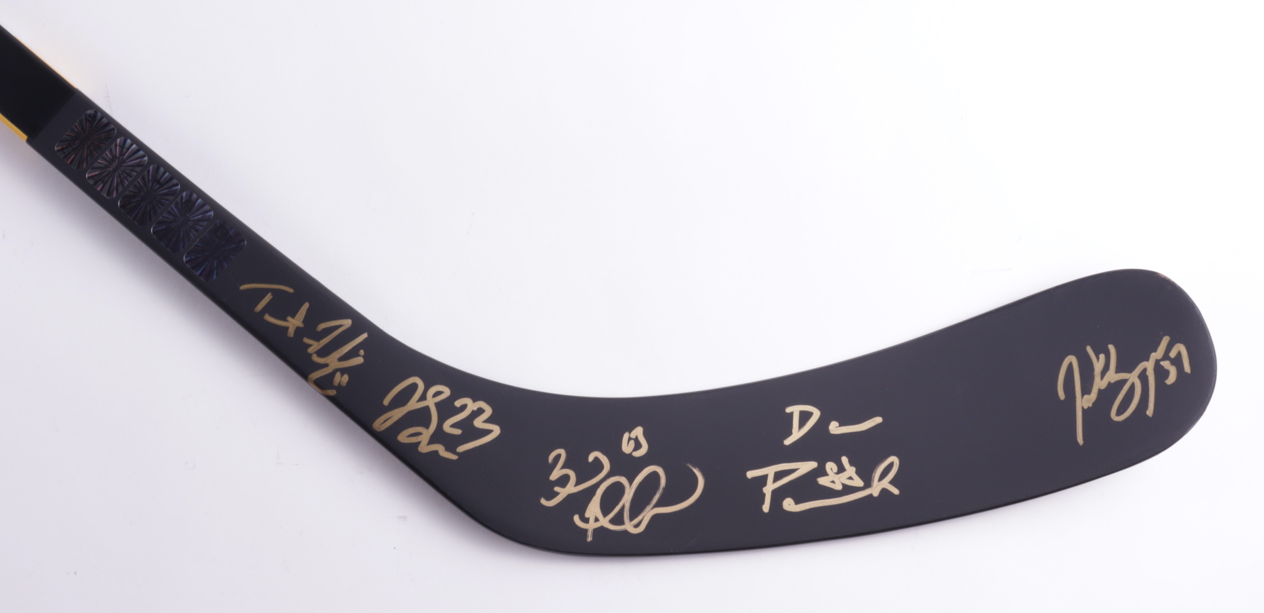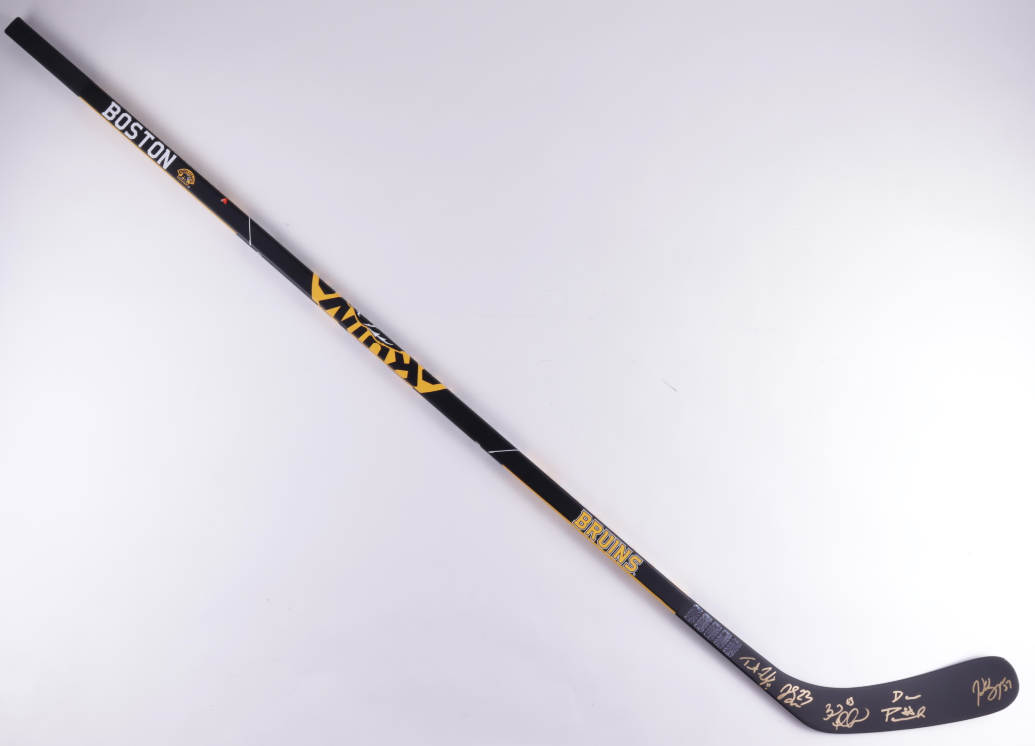 Full-size hockey stick has been hand-signed Trent Frederic, Brad Marchand, Patrice Bergeron, David Pastrnak & Jack Studnicka. (Boston Bruins)