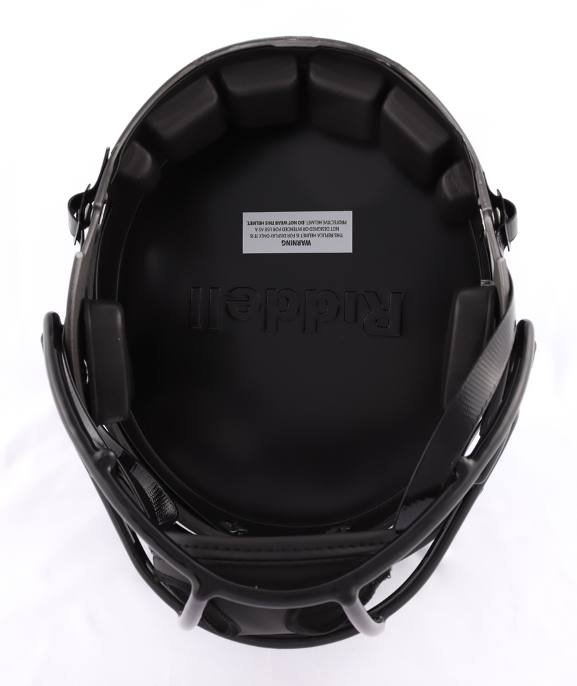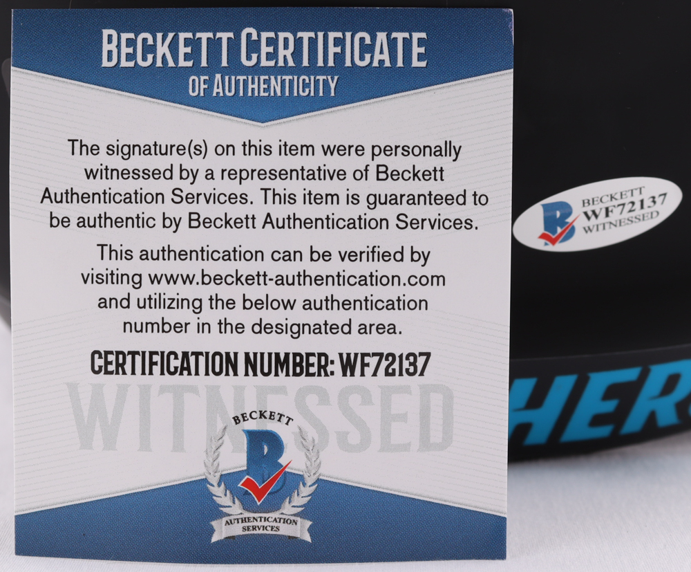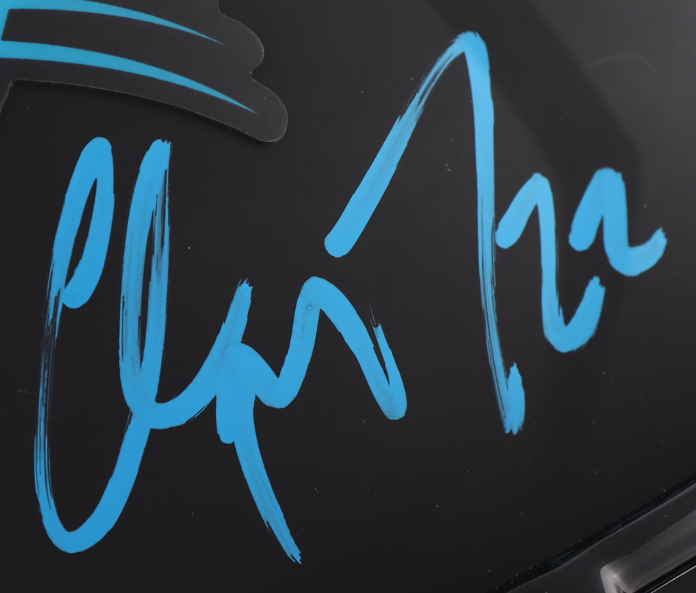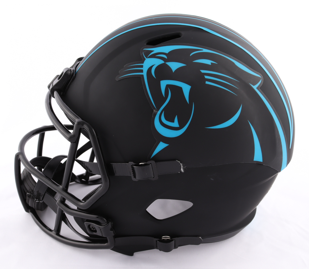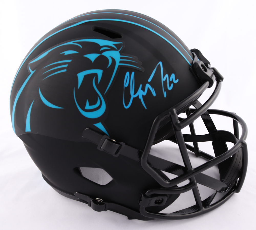 Riddell Carolina Panthers full-size replica Eclipse Alternate Speed helmet has been hand-signed by Christian McCaffrey. Please note, there are scuffing and scratches on top of the helmet.