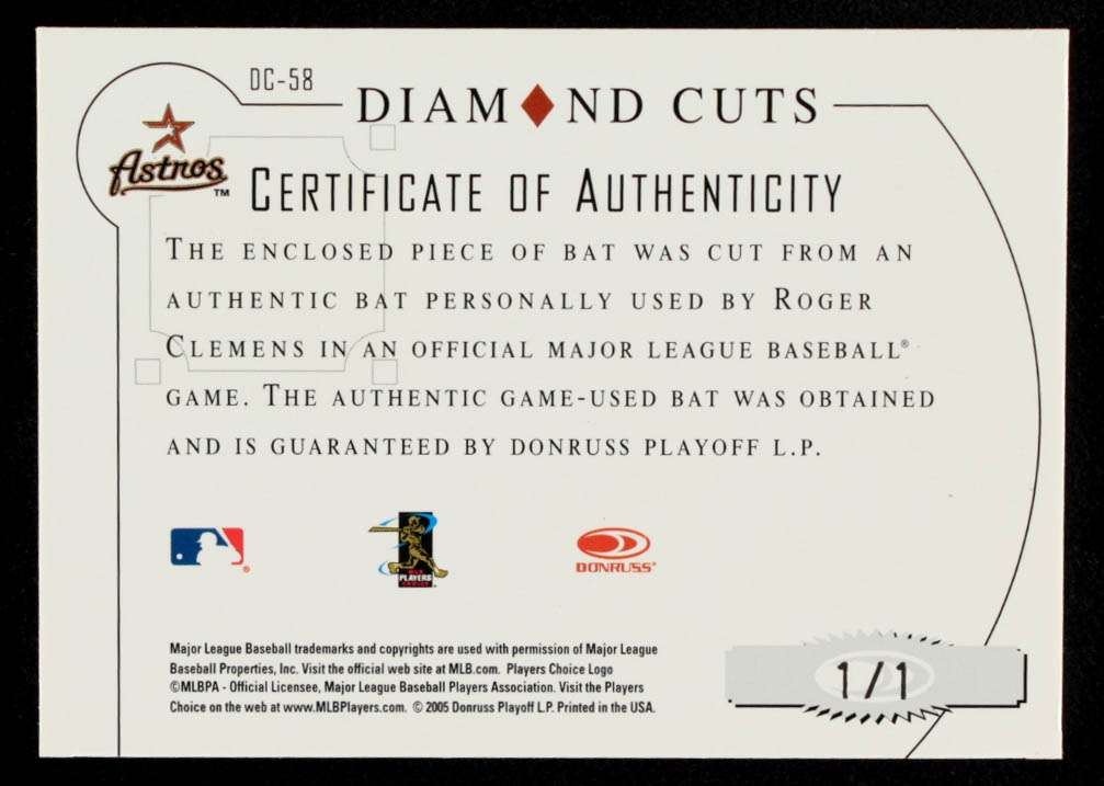 Roger Clemens 2005 Diamond Kings Diamond Cuts Signature Bat #1/1