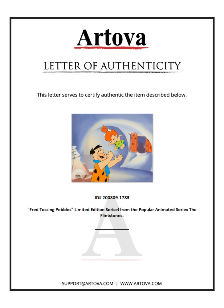 This truly wonderful collector's item from America's animation pop culture will bring cheer to fans of both past and present! "Fred Tossing Pebbles" is a limited edition sericel with a full color background, officially licensed by Universal Studios Licensing and Hanna-Barbera! Includes Certificate of Authenticity! Measures approx. 12.5" x 10.5" (sericel and background).