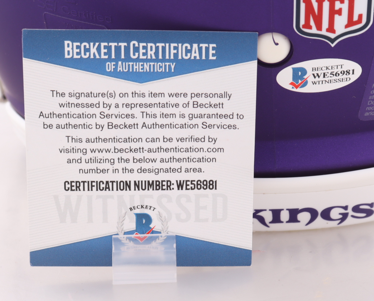 Riddell Minnesota Vikings full-size authentic on-field Speed helmet. Hand-signed by Justin Jefferson (Minnesota Vikings) and Randy Moss (Minnesota Vikings, HOF).