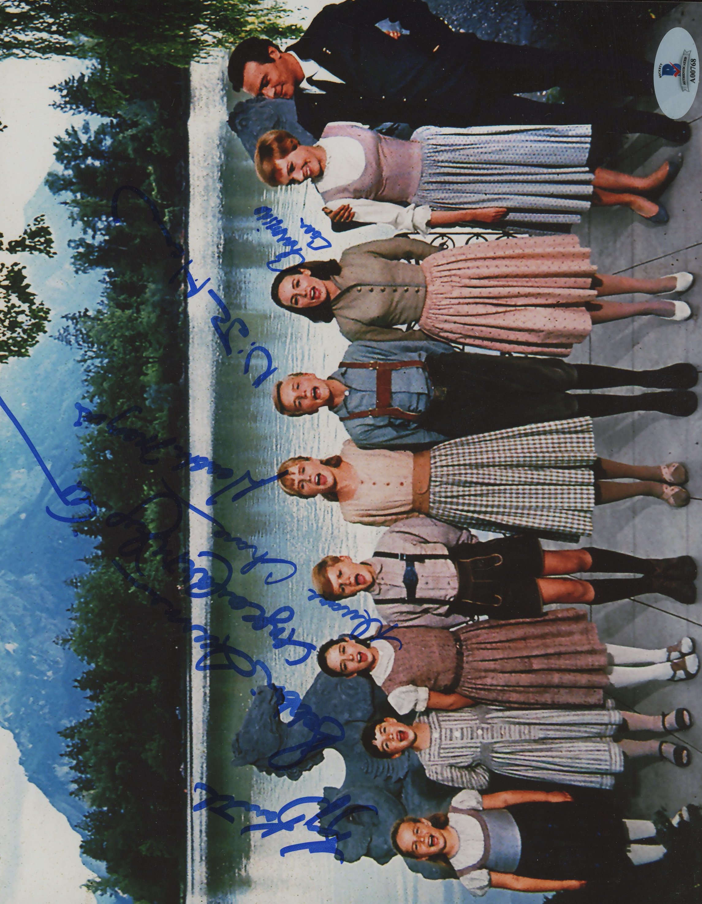 Photo measures 8" x 10" in size and has been hand-signed by Charmain Carr, Nicholas Hammond, Heather Menzies, Duane Chase, Angela Cartwright, Debbie Turner, and Kym Karath.