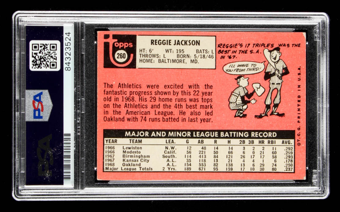 1969 Topps #260 Rookie Card has been hand-signed by Reggie Jackson (Oakland Athletics, HOF).