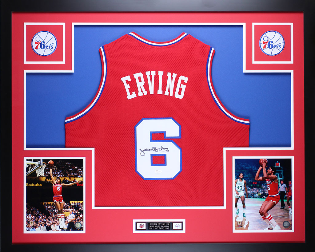 Display measures approximately 35" x 43" in size and features a jersey that has been hand-signed by Julius Erving (HOF).