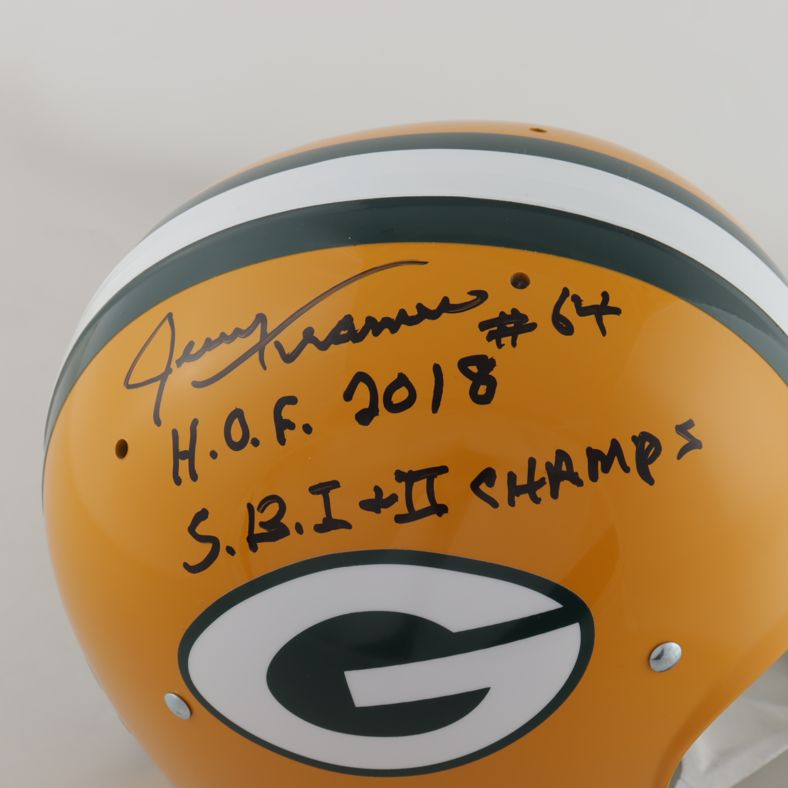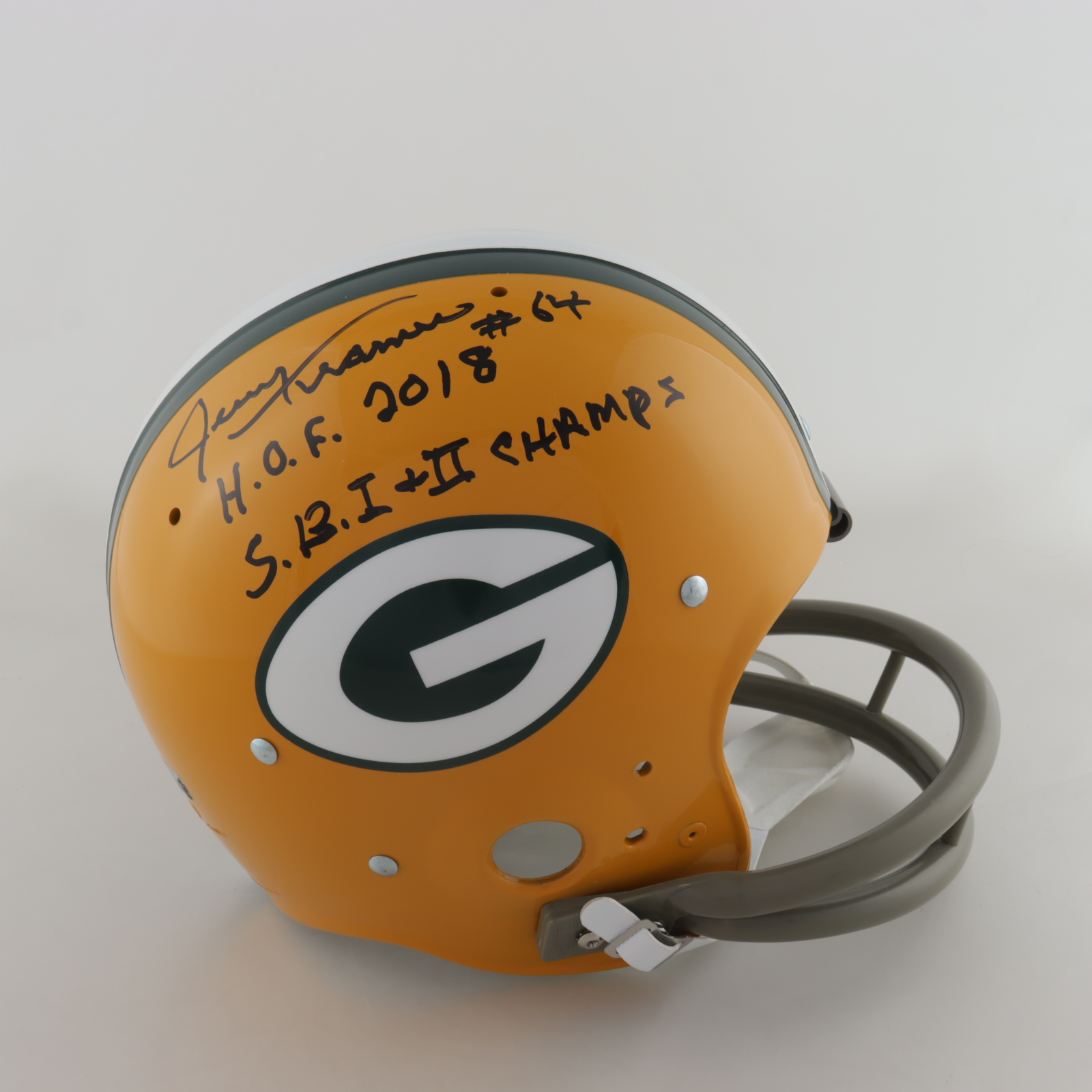 Jerry Kramer Signed Packers Full-Size Throwback Suspension Helmet Inscribed "S.B. I + II Champs" & "H.O.F. 2018" (Radtke COA)