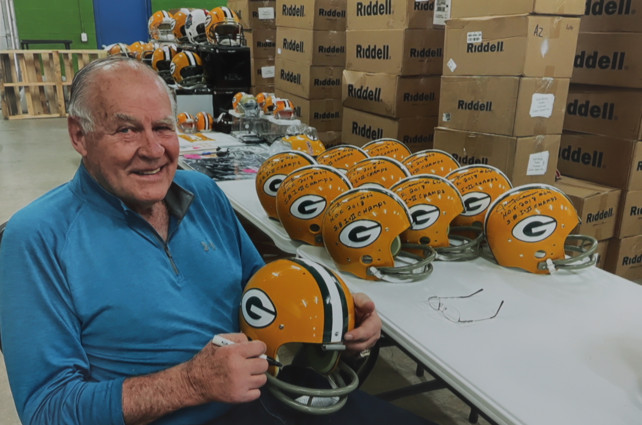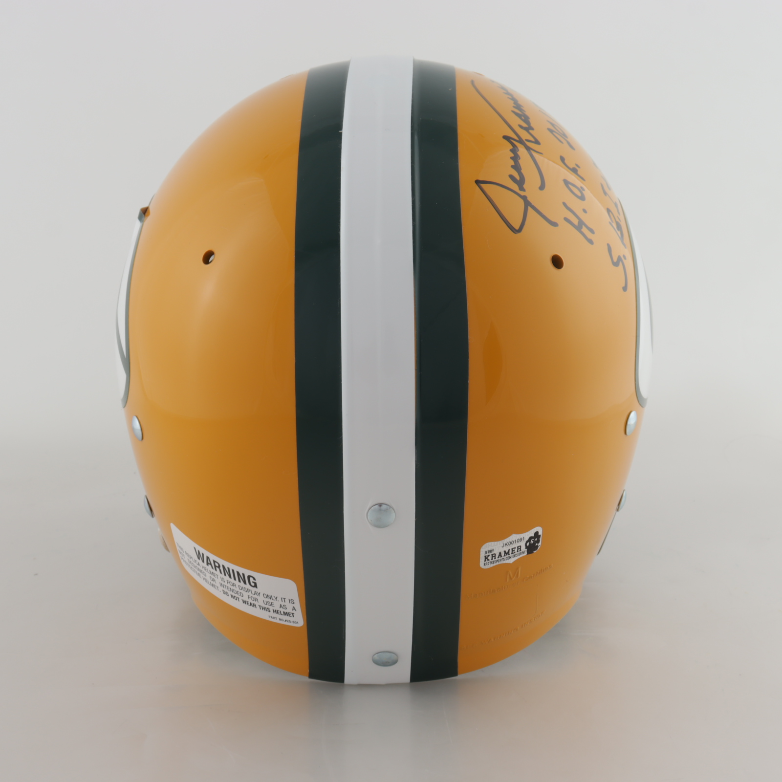 Riddell Green Bay Packers full-size replica throwback suspension helmet. Has been hand-signed by Jerry Kramer (HOF).