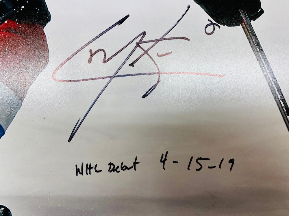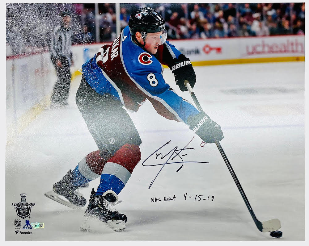 Photo measures 16" x 20" in size and has been hand-signed and inscribed by Cale Makar (Colorado Avalanche).