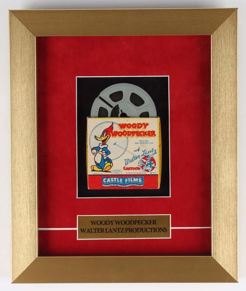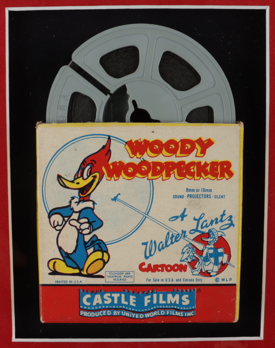 Custom frame measures 10" x 12" in size and contains a Woody Woodpecker 1950s 7mm film with the original box.