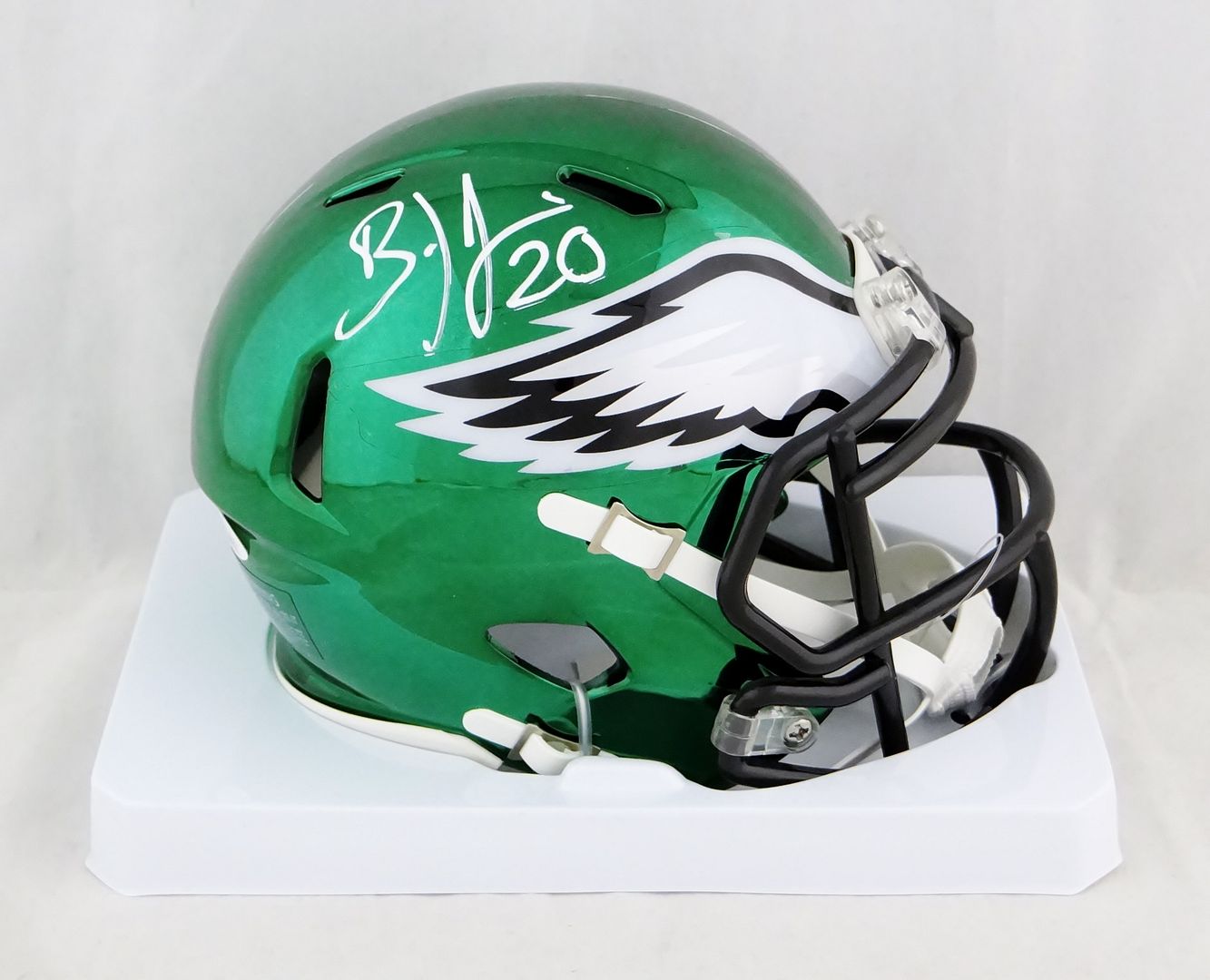 Riddell Philadelphia Eagles chrome speed mini helmet has been hand-signed by Brian Dawkins (HOF).
