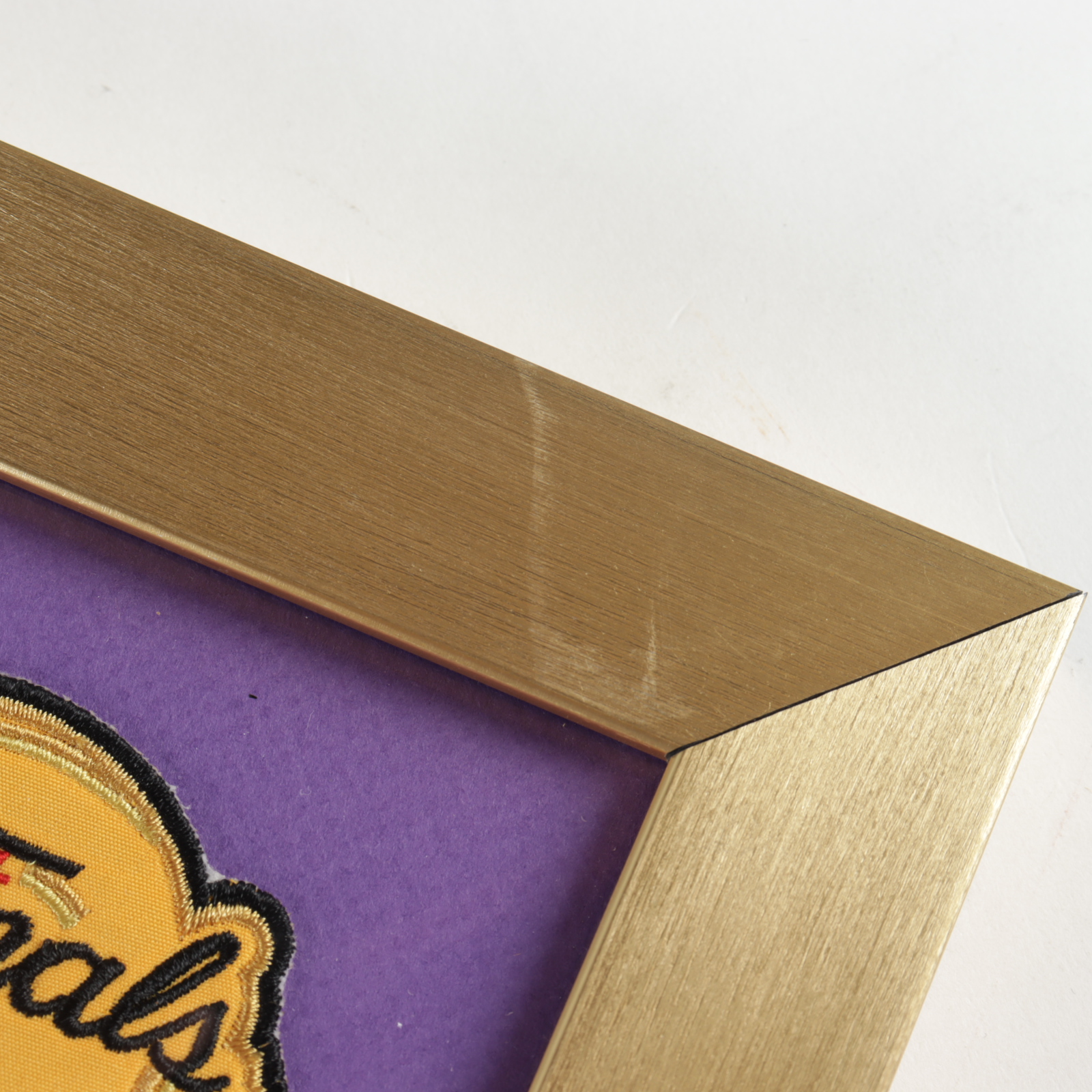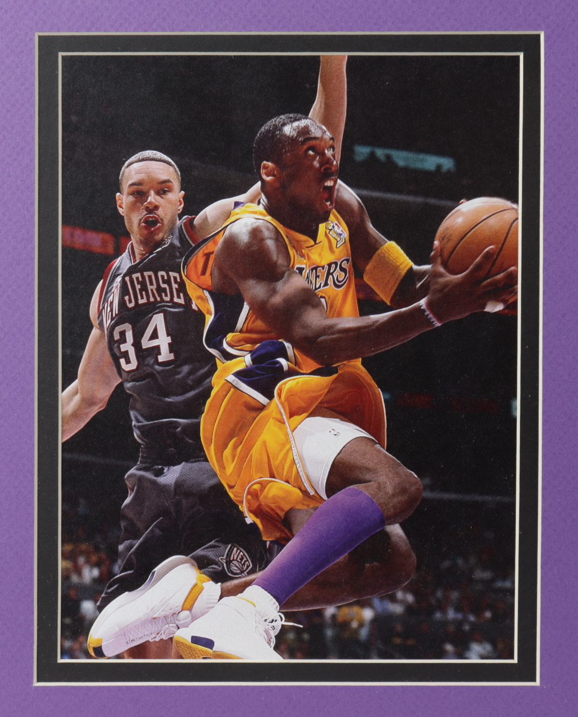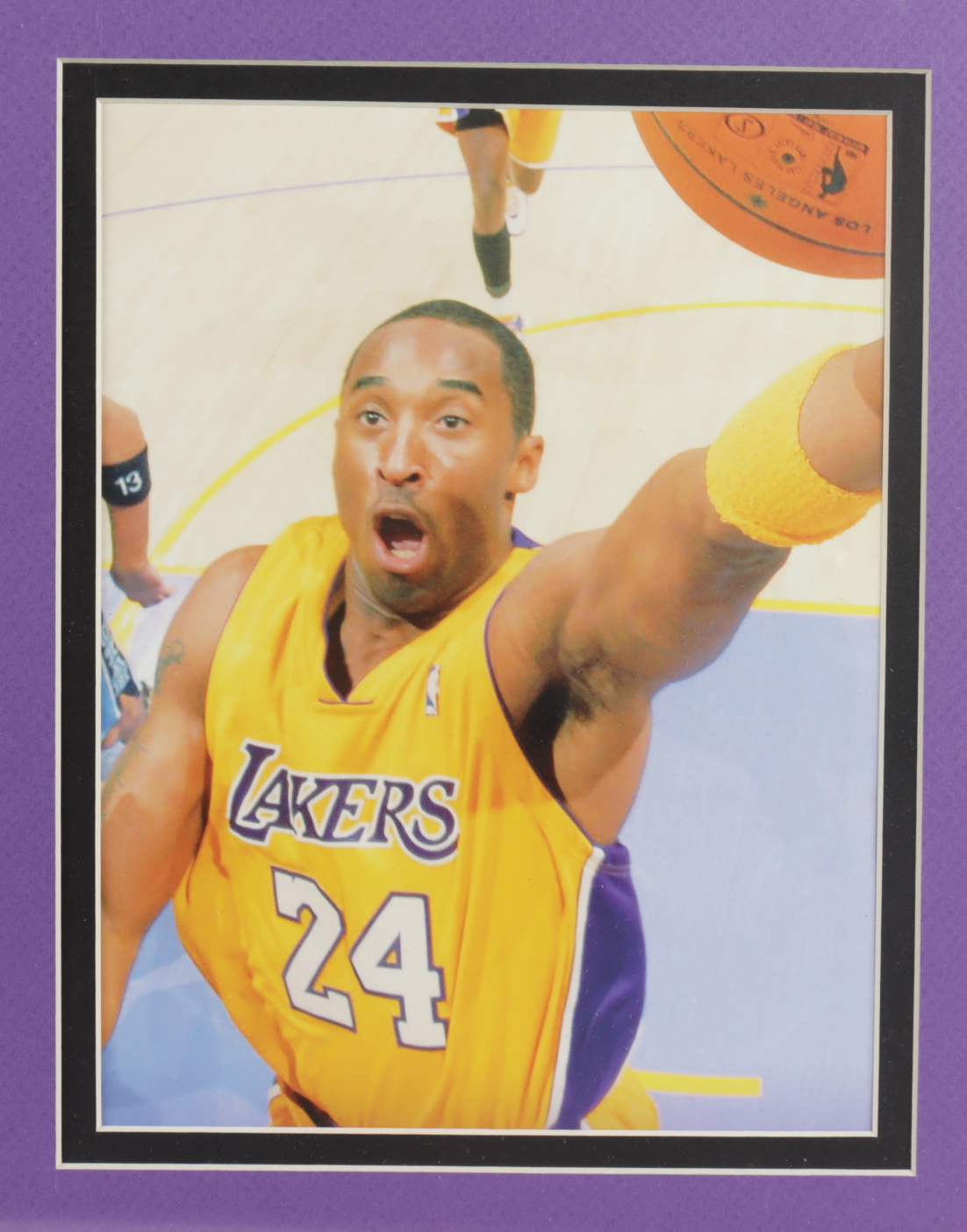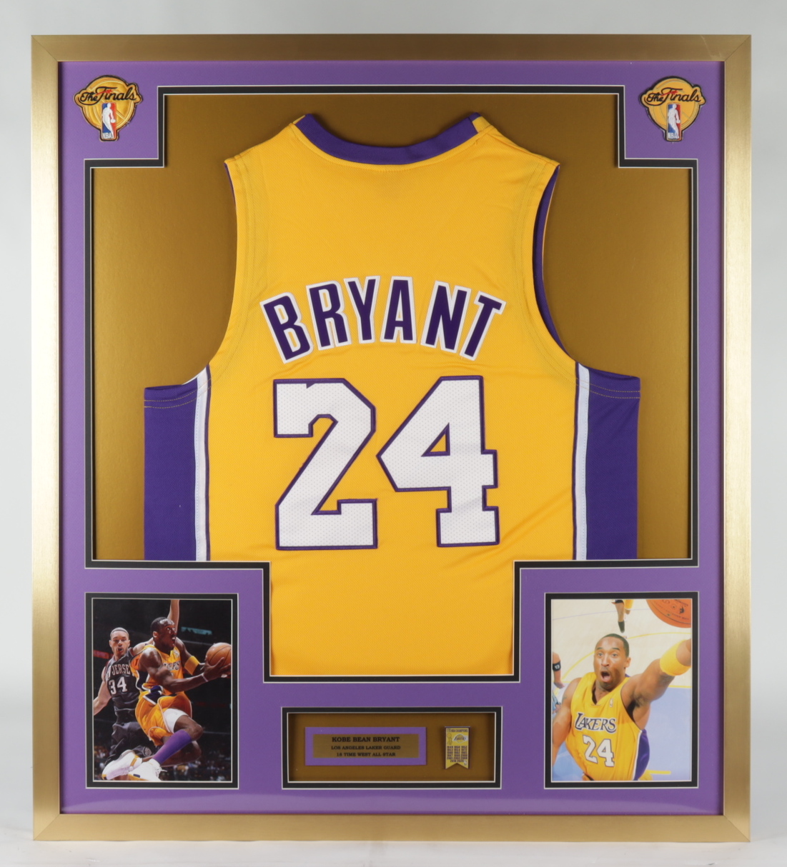 Custom frame measures 32" x 36" in size and features a jersey of Kobe Bryant (D. 2020, Los Angeles Lakers, HOF). Display also features two 8x10 photos, two patches, and a Lakers NBA Finals Championship banner. The jersey is unsigned. Please note, frame has some scratch marks in the upper right corner.